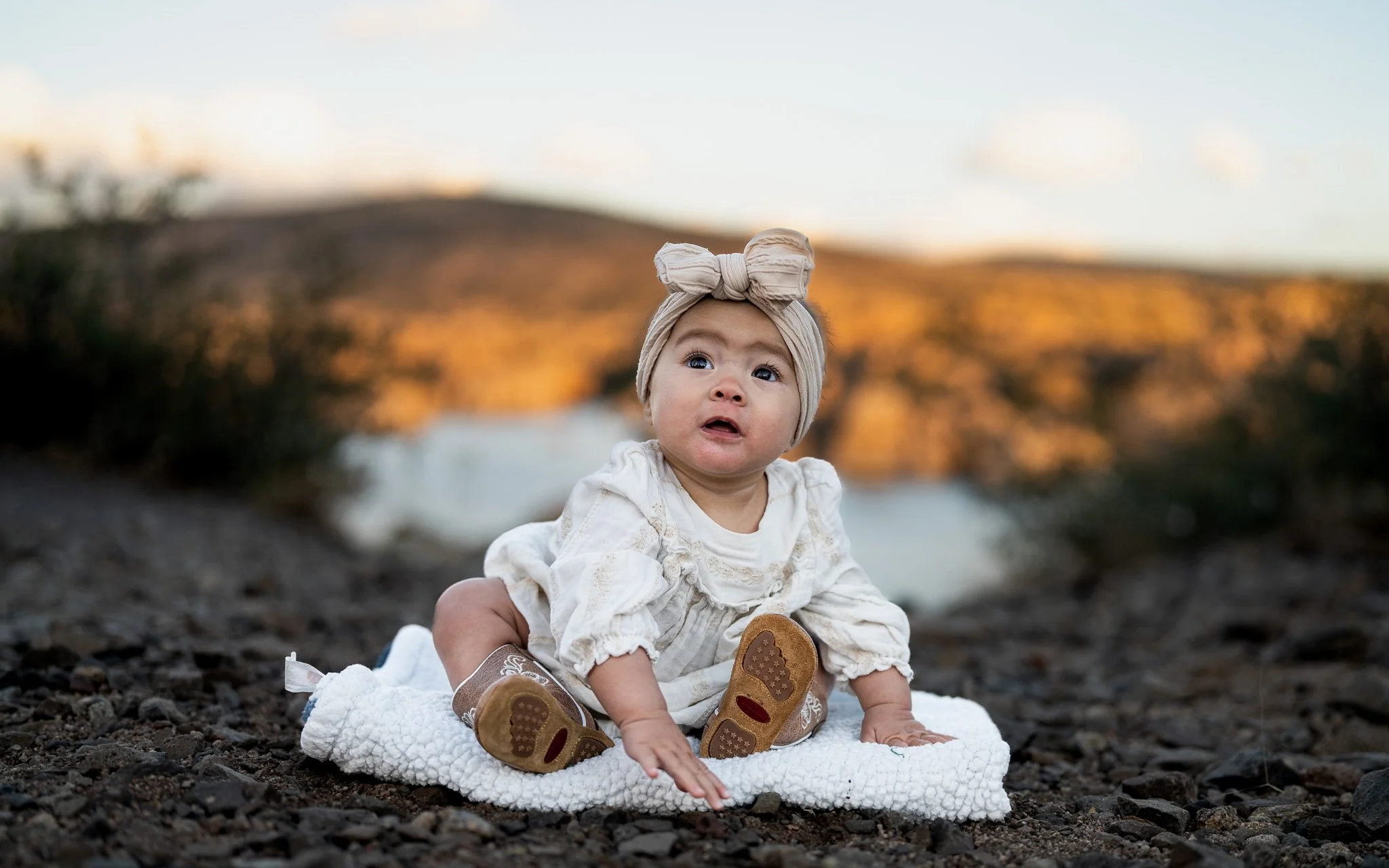 A baby girl with a beige bow headband and cream-colored dress crawling on a white blanket outdoors with blurred hills and a body of water in the background.