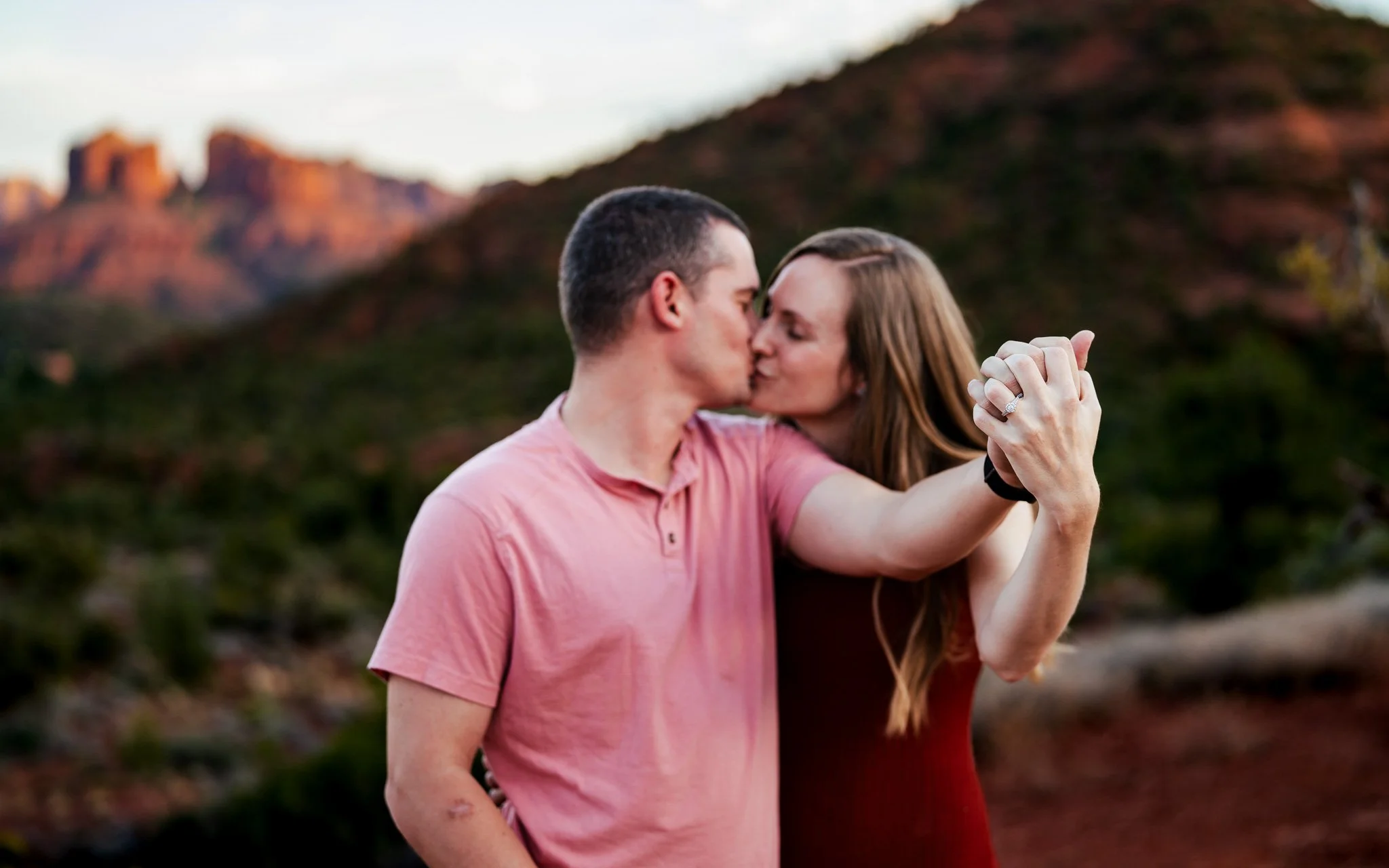 A couple kissing outdoors with a mountain landscape in the background, the woman showing her engagement ring as they hold hands.