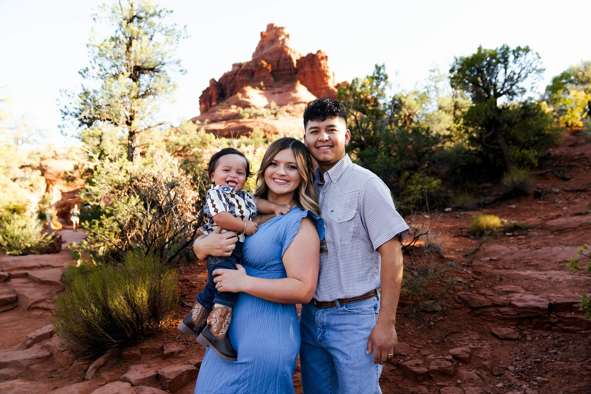 A family of three posing outdoors with red rock formations and greenery in the background, including a woman holding a young boy and a man standing next to them, all smiling.