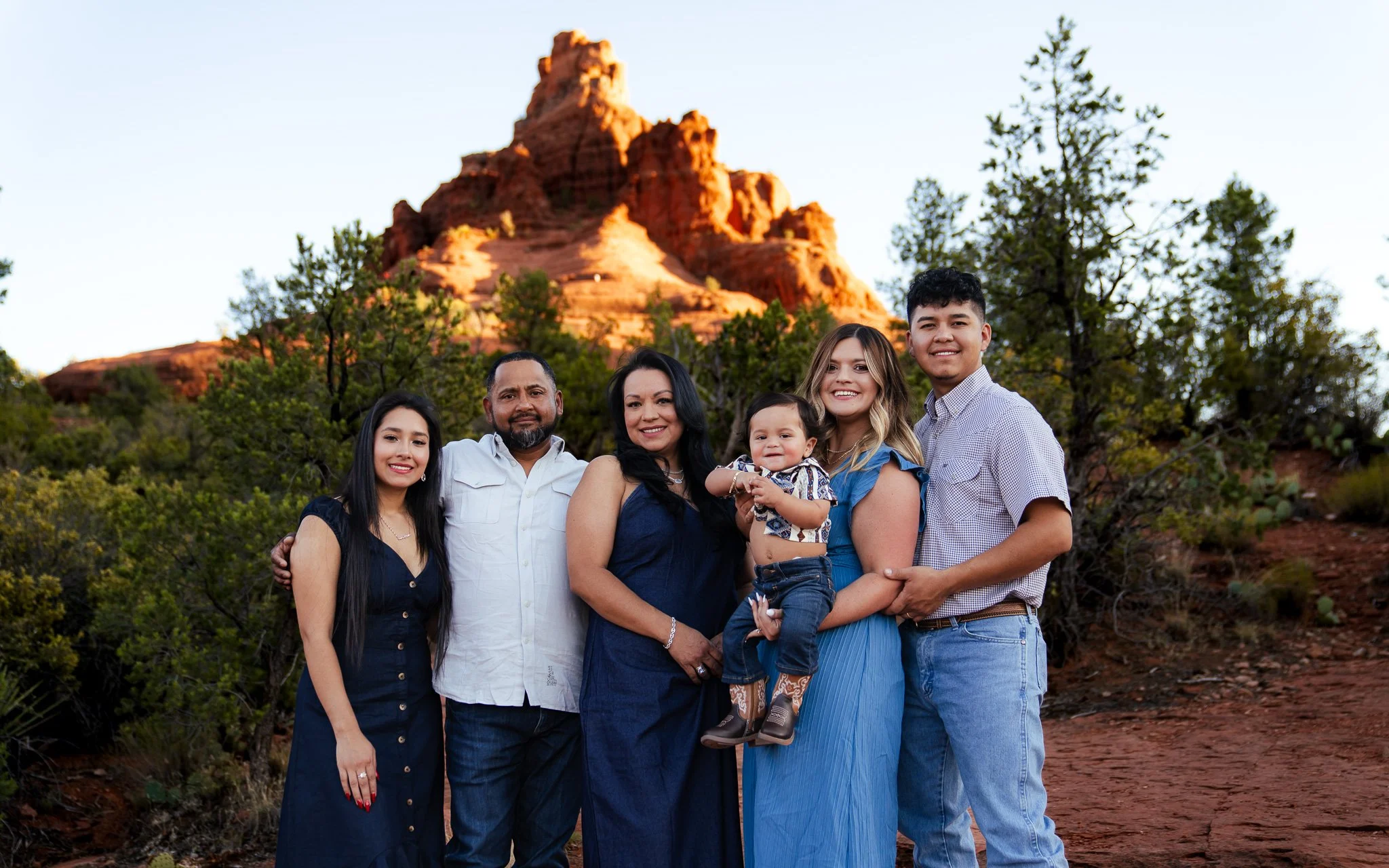 Family of six standing outdoors in front of red rock formations and greenery during daylight.