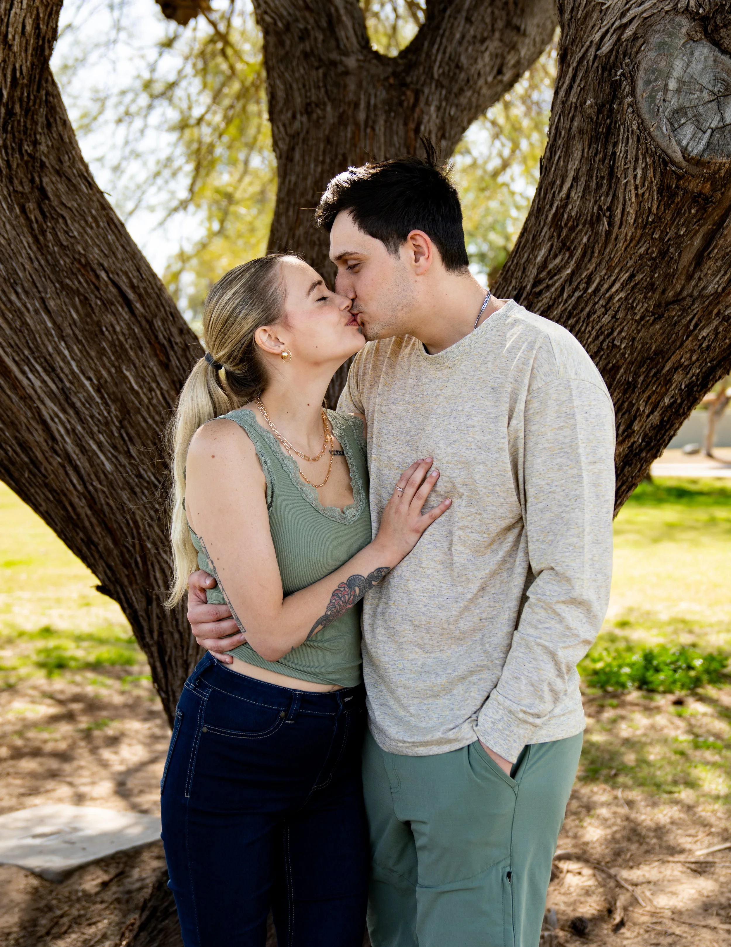 A couple kissing outdoors in front of a tree with sunlight filtering through the branches.