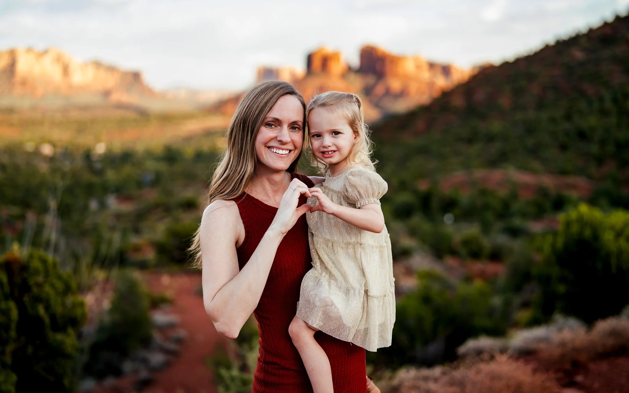 A smiling woman with long brown hair holding a young girl in a beige dress with blonde hair, both making a heart shape with their fingers. The background features rocky red cliffs and greenery on a clear day.