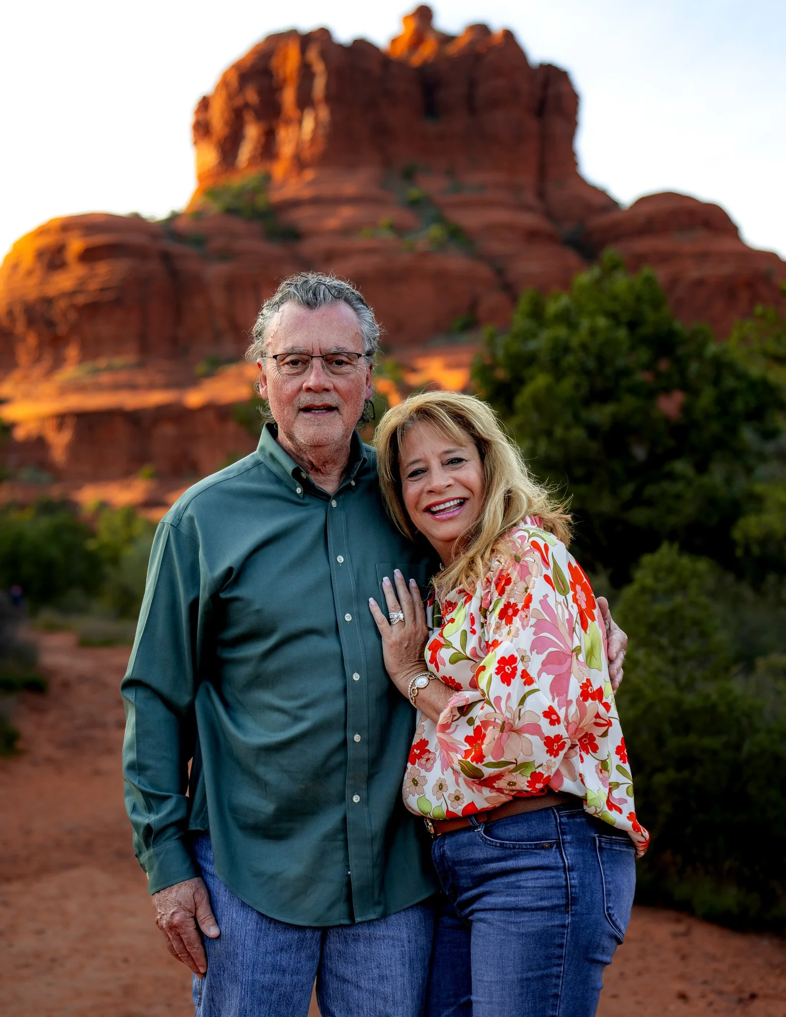 A happy middle-aged couple standing outdoors with red rock formations and green trees in the background, smiling at the camera.