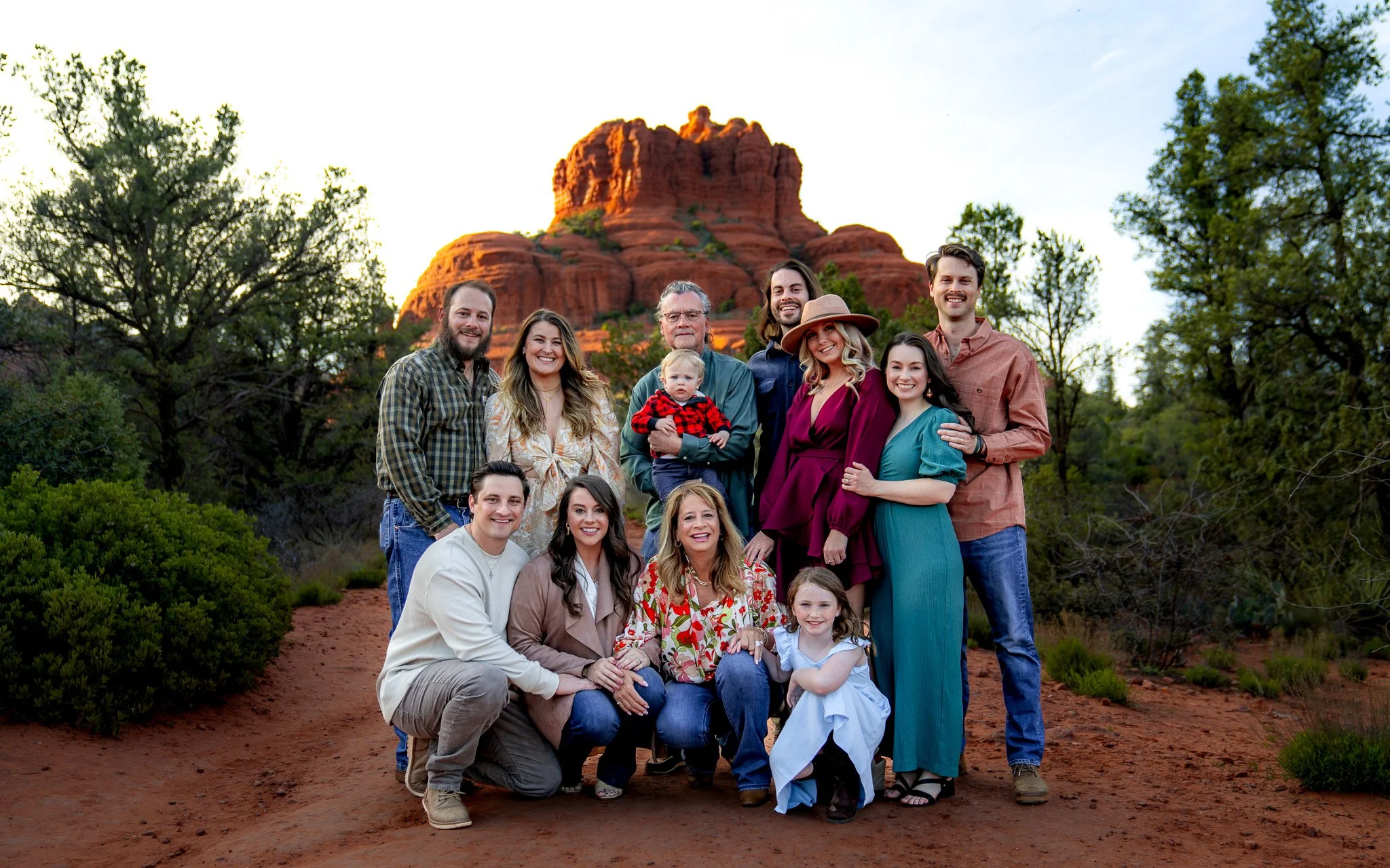Family of six standing outdoors in front of a red rock formation at sunset, smiling at the camera.