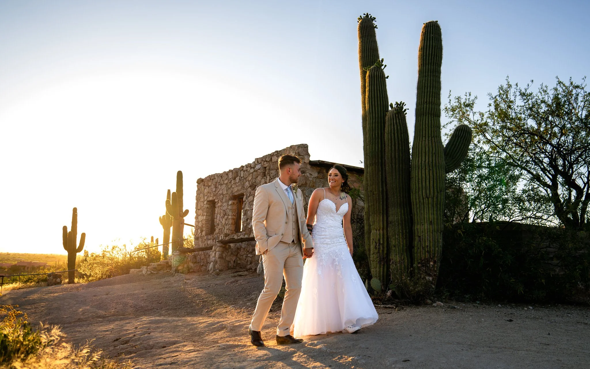 A bride and groom in wedding attire holding hands and smiling at each other outdoors at sunset, with desert cacti and a stone building in the background.