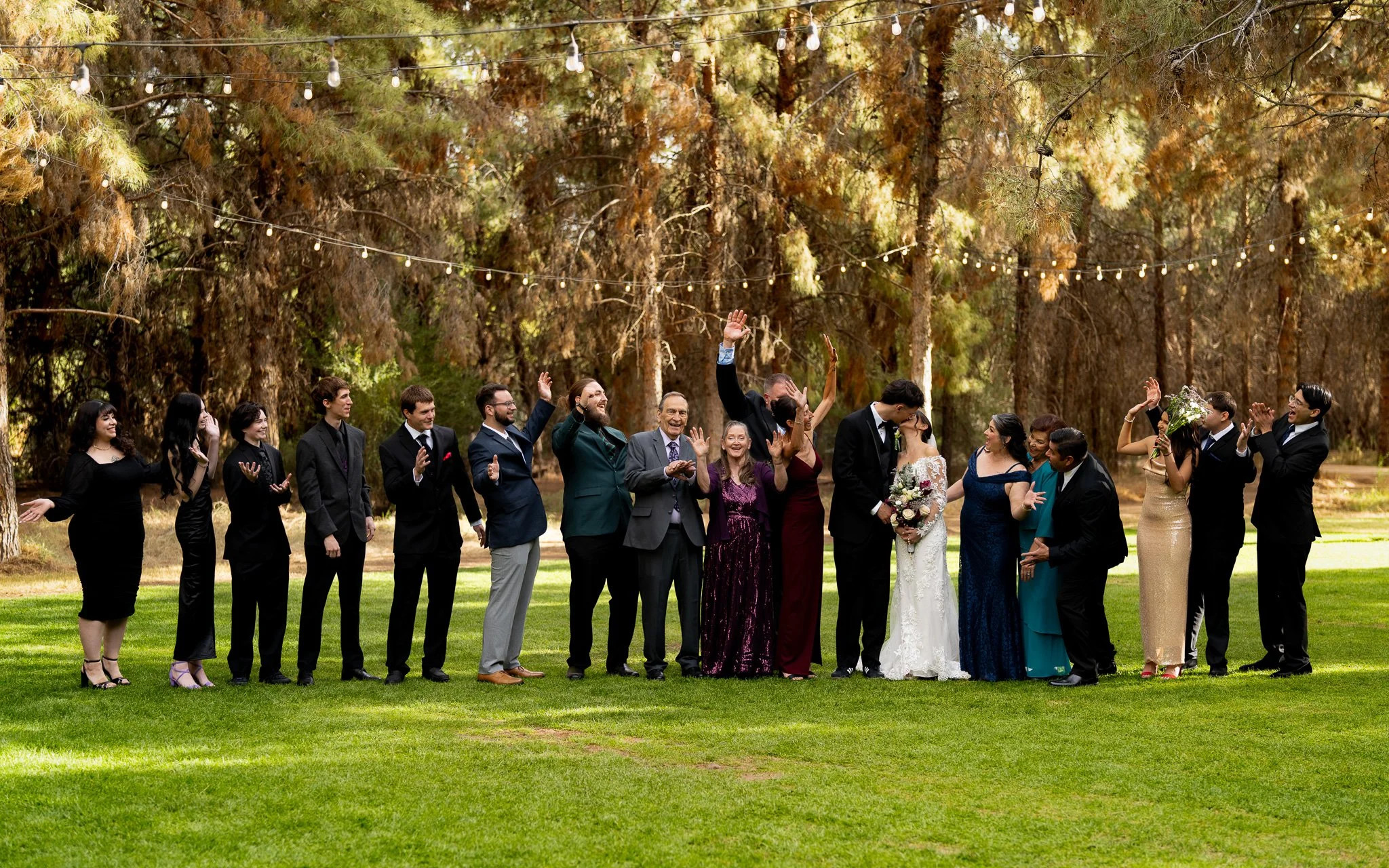 Group of people celebrating a wedding outdoors in a park or garden, with the bride and groom at the center, surrounded by family and friends, under string lights hanging from trees.