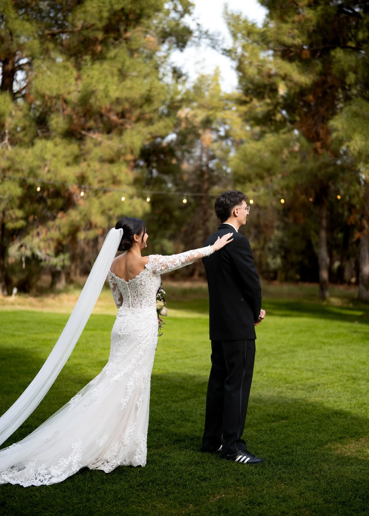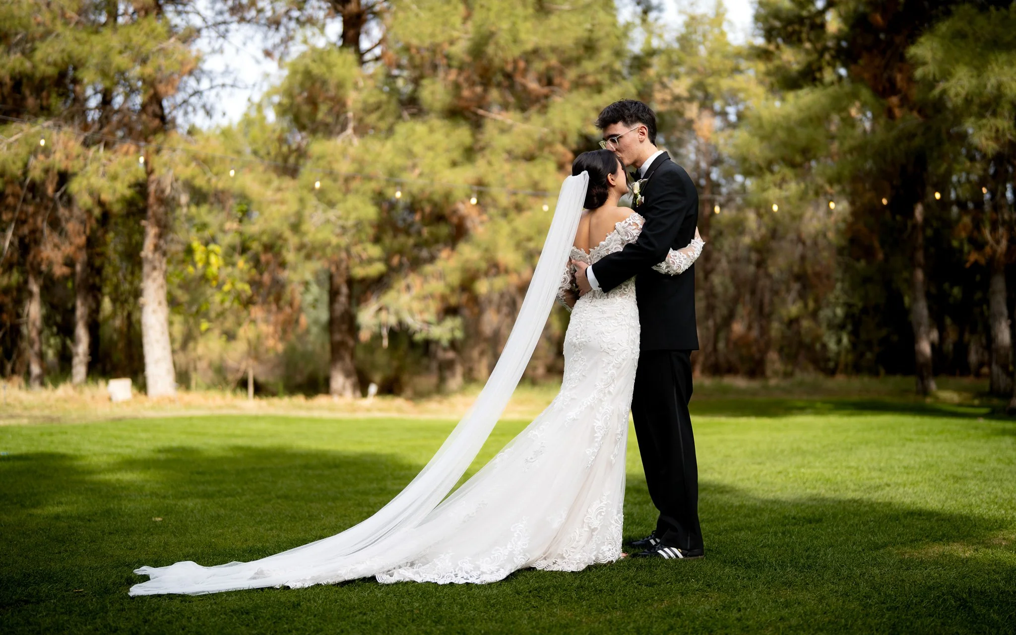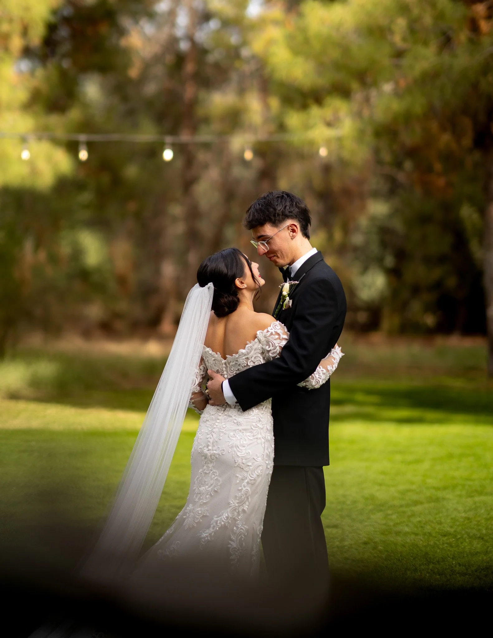 A bride and groom stand close together outdoors on a grassy area, embracing and about to kiss, with string lights and tall trees in the background.