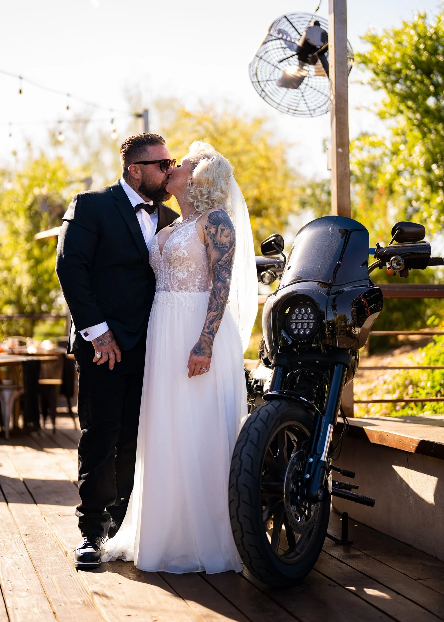 A bride and groom kissing outdoors, the bride wearing a white lace wedding dress with tattoos on her arm, and the groom in a black suit and sunglasses, beside a black motorcycle on a wooden deck, under string lights and surrounded by trees.