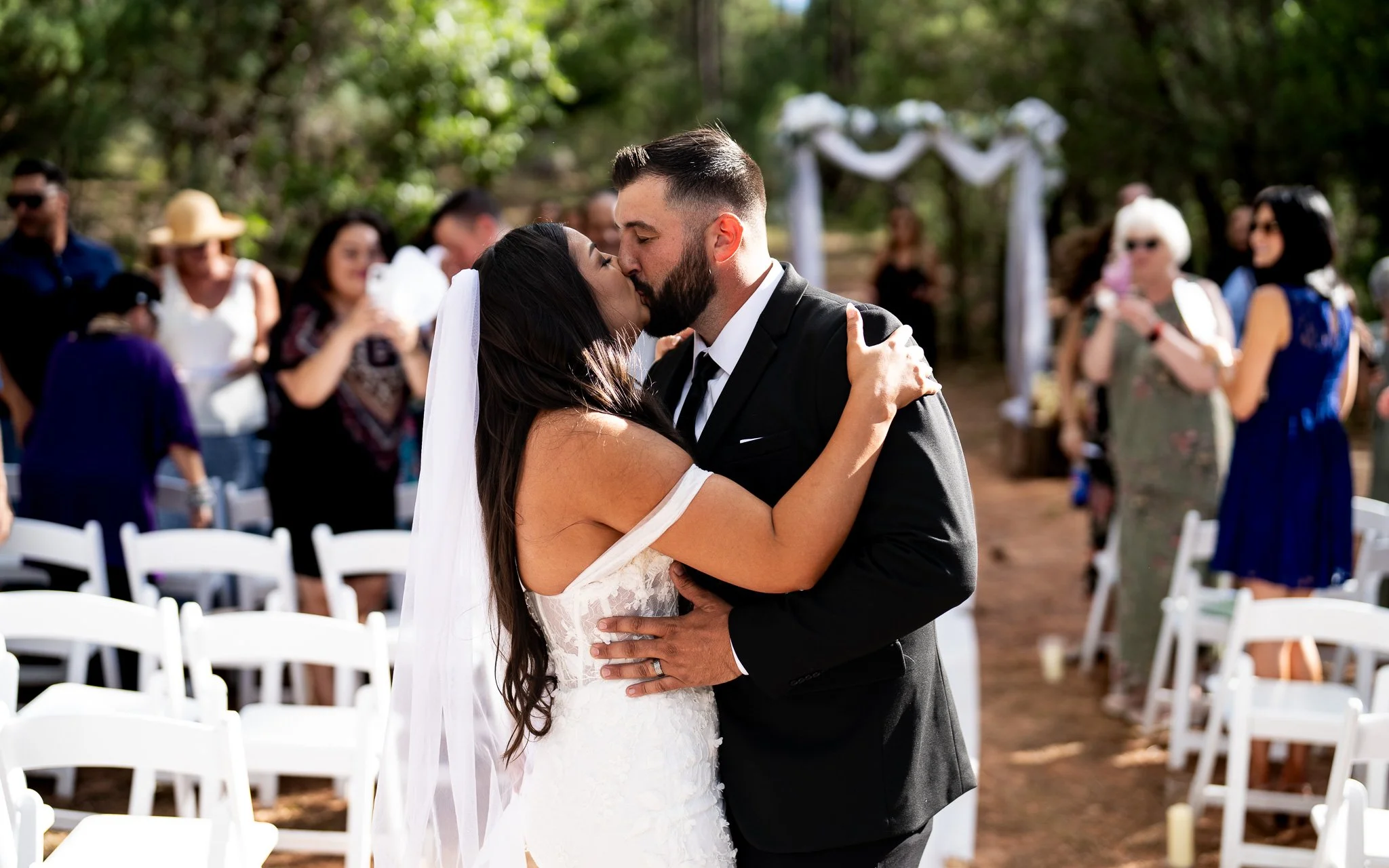 A bride and groom share a kiss at their outdoor wedding ceremony, with guests seated on white chairs watching.