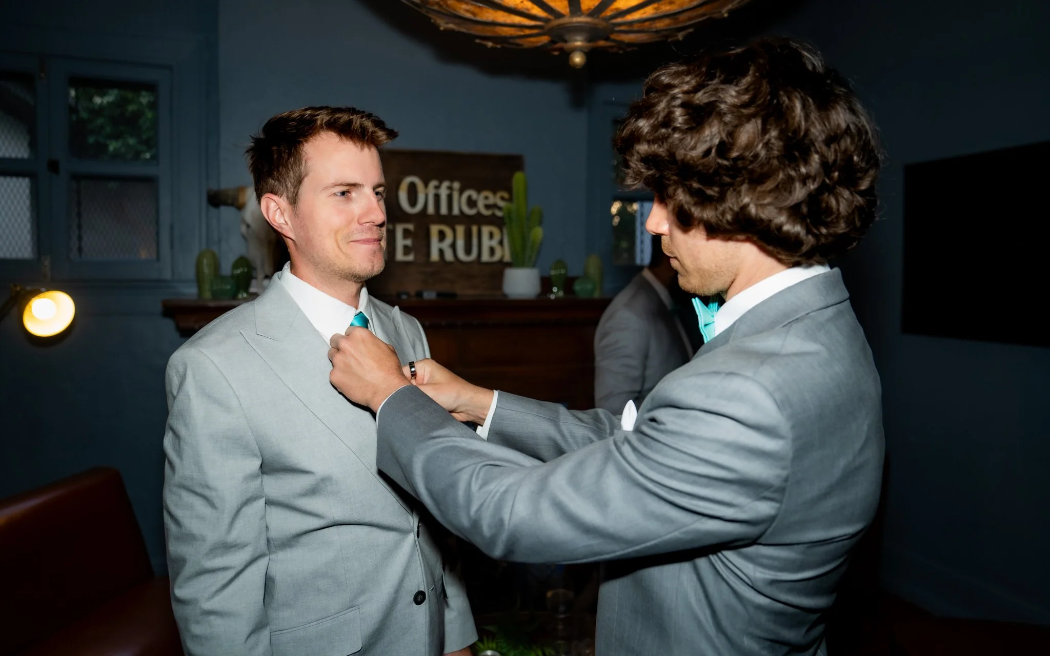 Two men in gray suits, one pinning a boutonniere on the other's lapel during a wedding or formal event indoors.