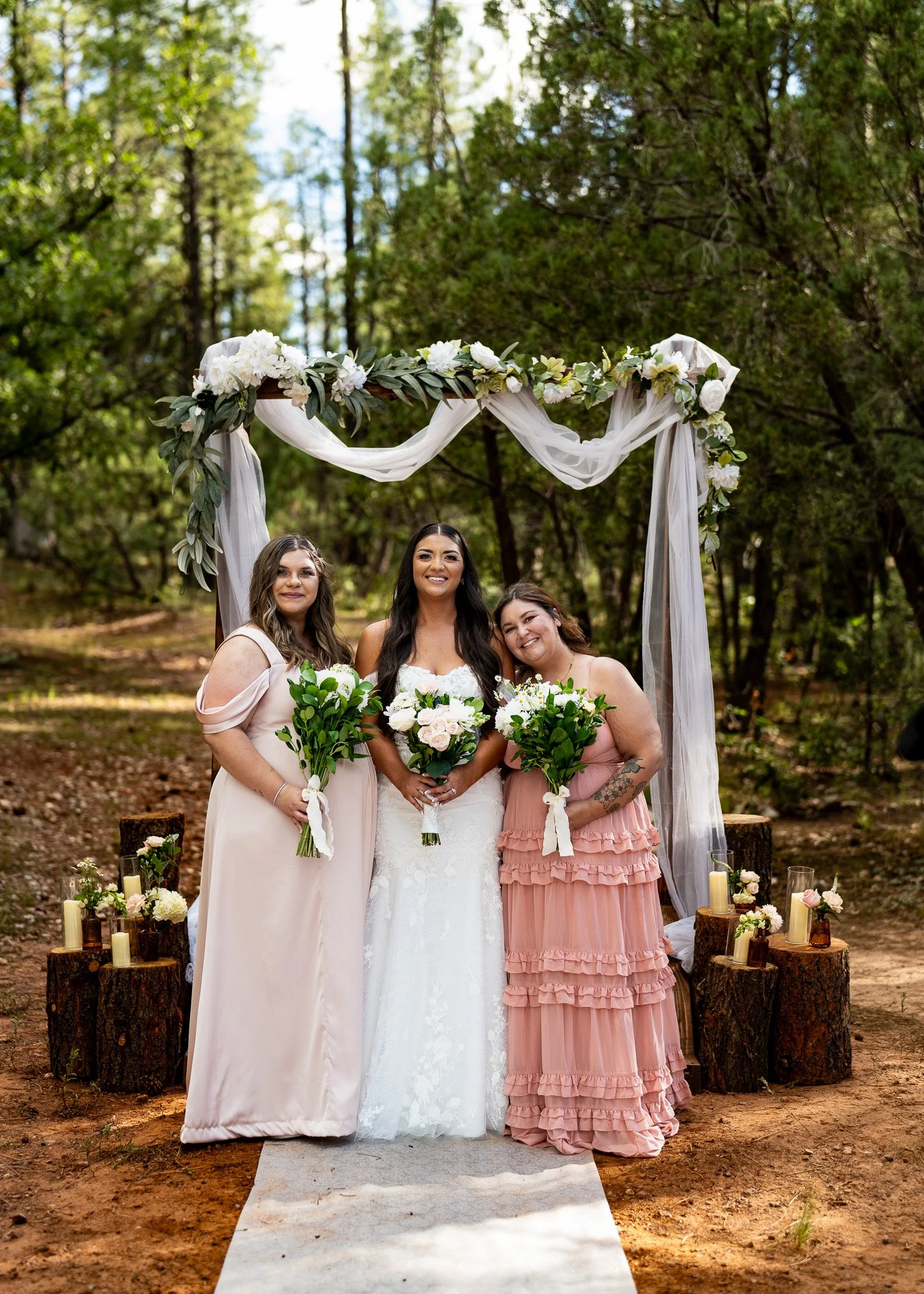 Three women in wedding attire standing under a floral wedding arch in a forest setting. The center woman is the bride in a white dress, flanked by two bridesmaids in pink dresses, holding bouquets of white flowers.
