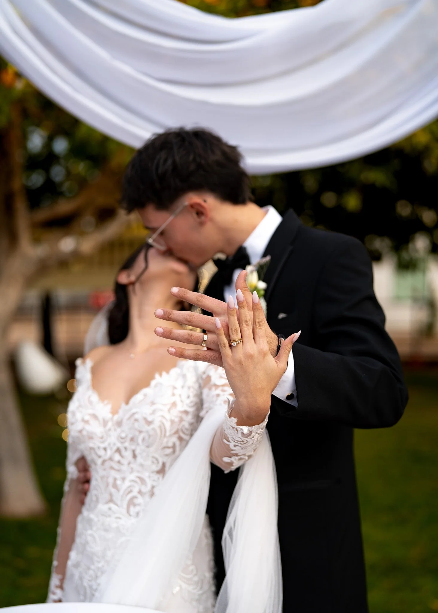 A newlywed couple sharing a kiss under a decorated wedding arch outdoors.