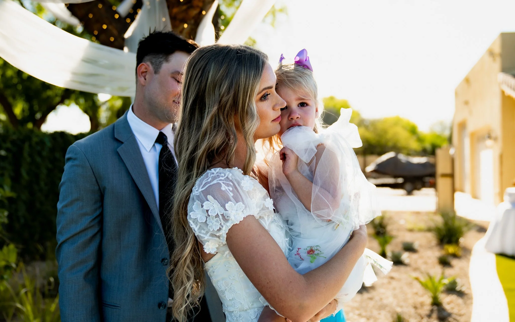 A woman holding a young girl at an outdoor wedding ceremony.