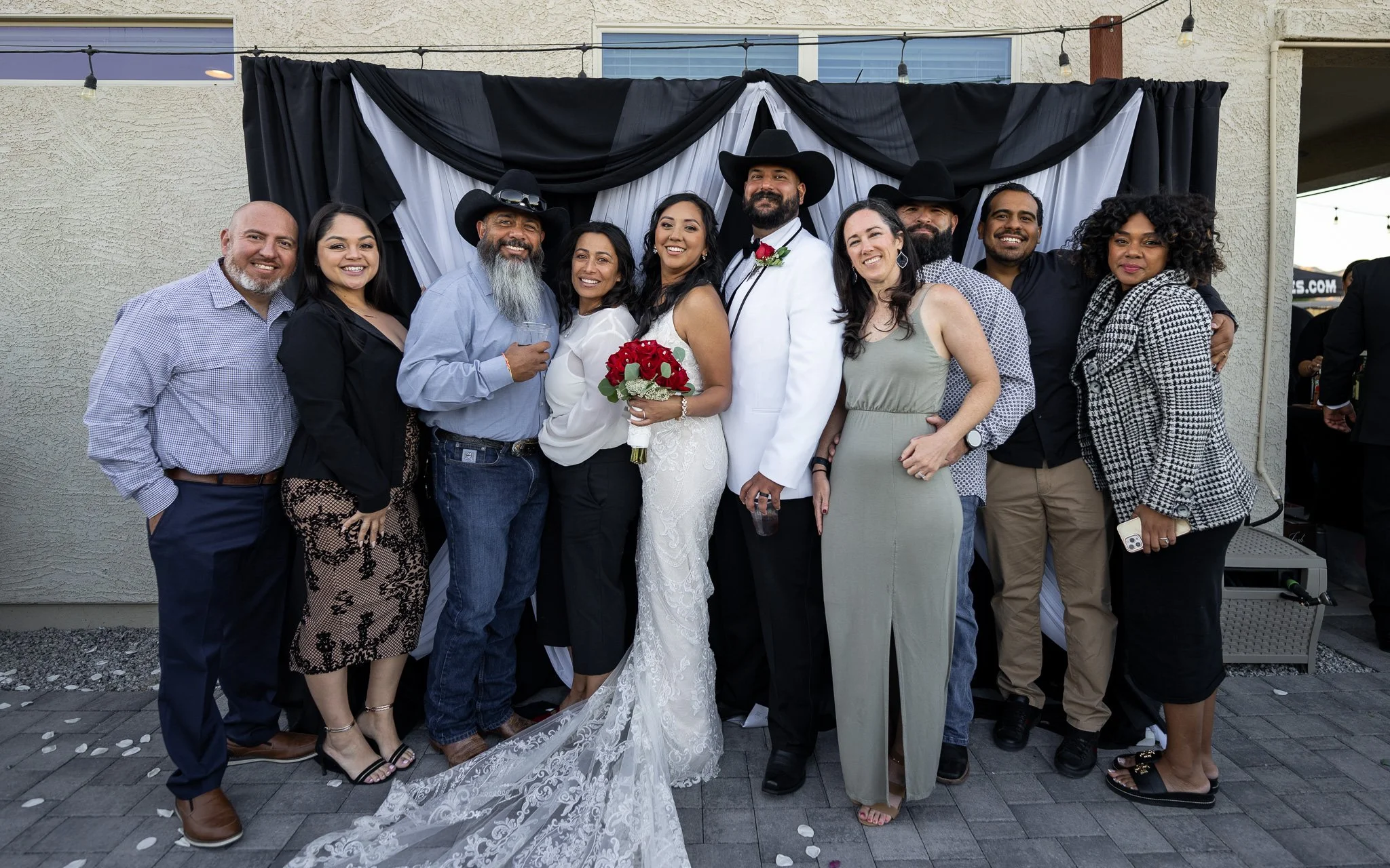 Group of people celebrating a wedding, with the bride holding a bouquet of red roses, and everyone smiling and posing together in front of a black and white draped backdrop.