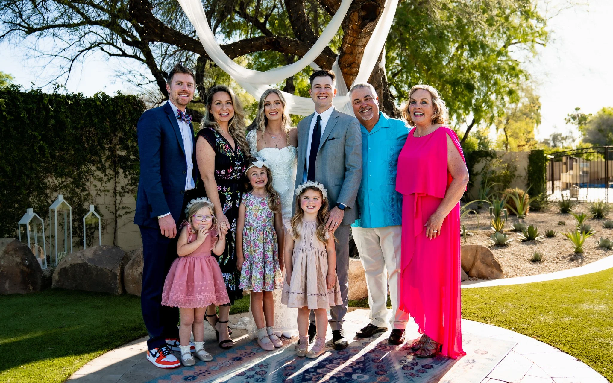 Family gathering outdoors with children, women, and men smiling under a tree with white fabric decorations, in a garden with rocks and plants.