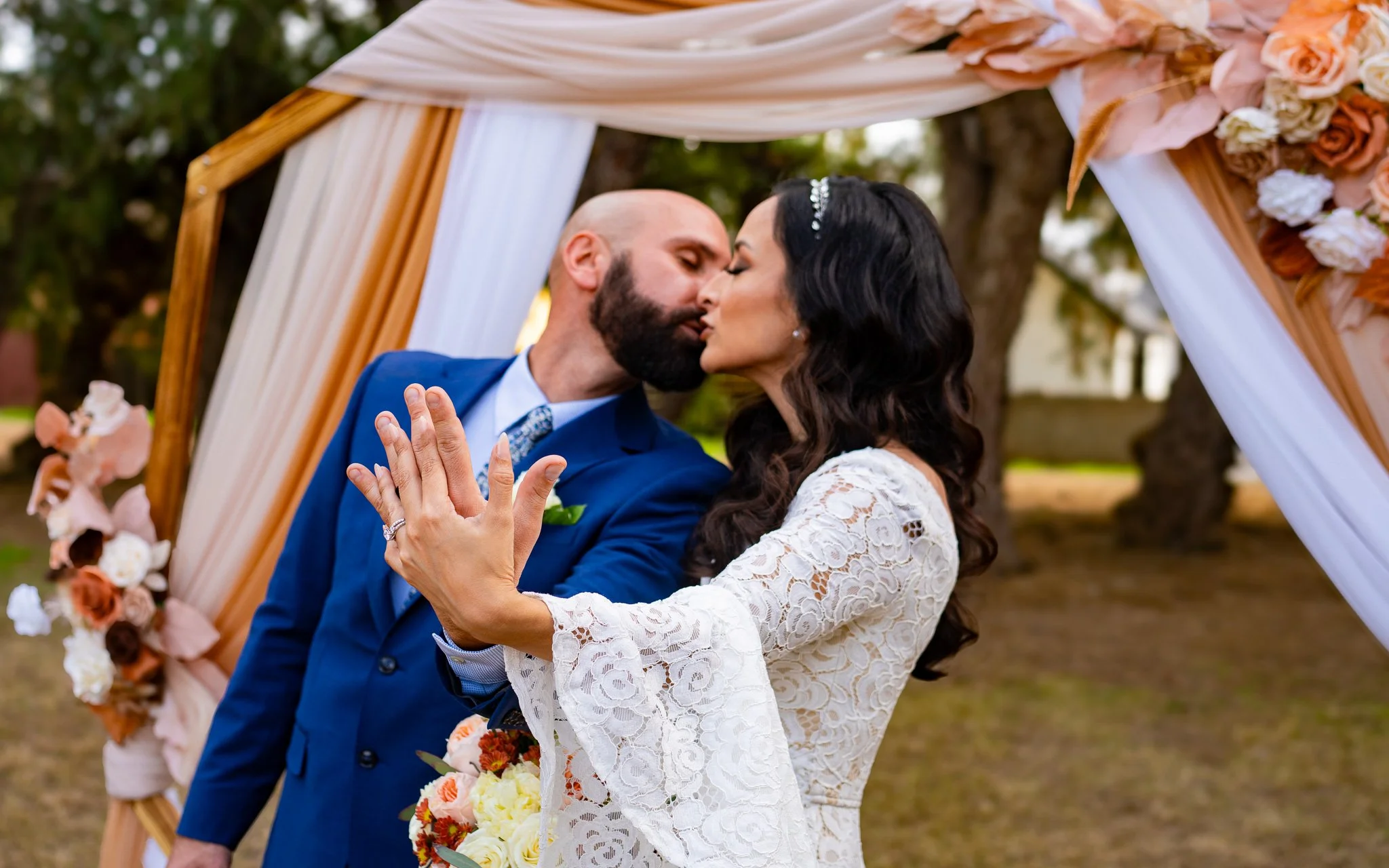 A bride in a white lace dress and a groom in a blue suit kiss under a wooden hexagonal wedding arch decorated with peach and white drapery and floral arrangements, outdoors in a grassy area with trees in the background.