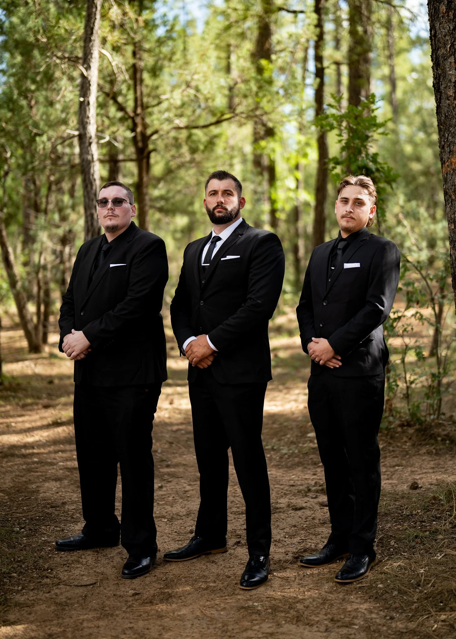 Three men in black suits standing in a wooded outdoor area, posing with serious expressions.