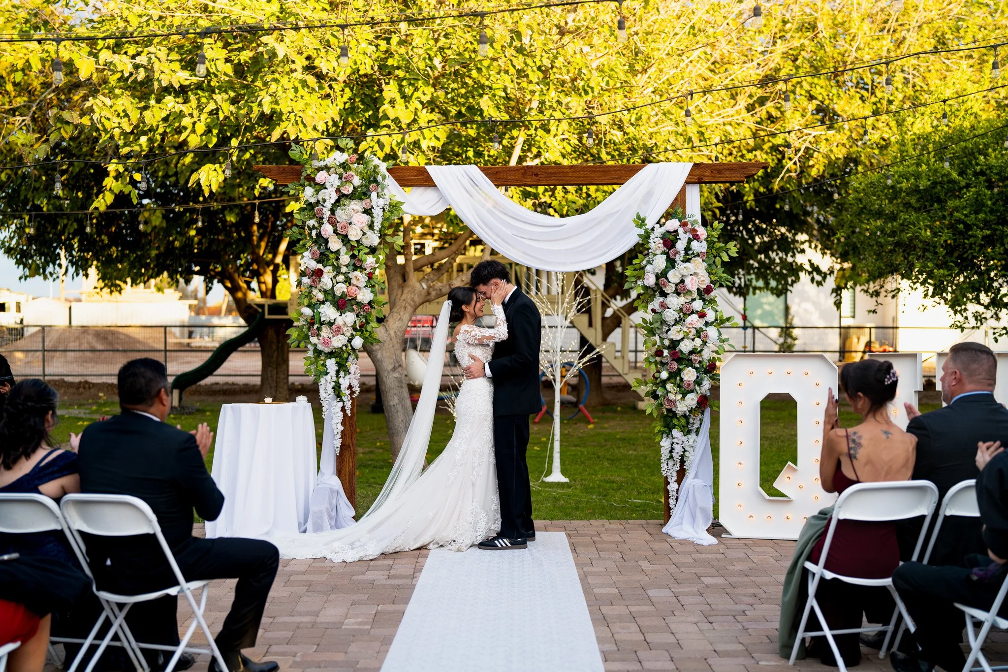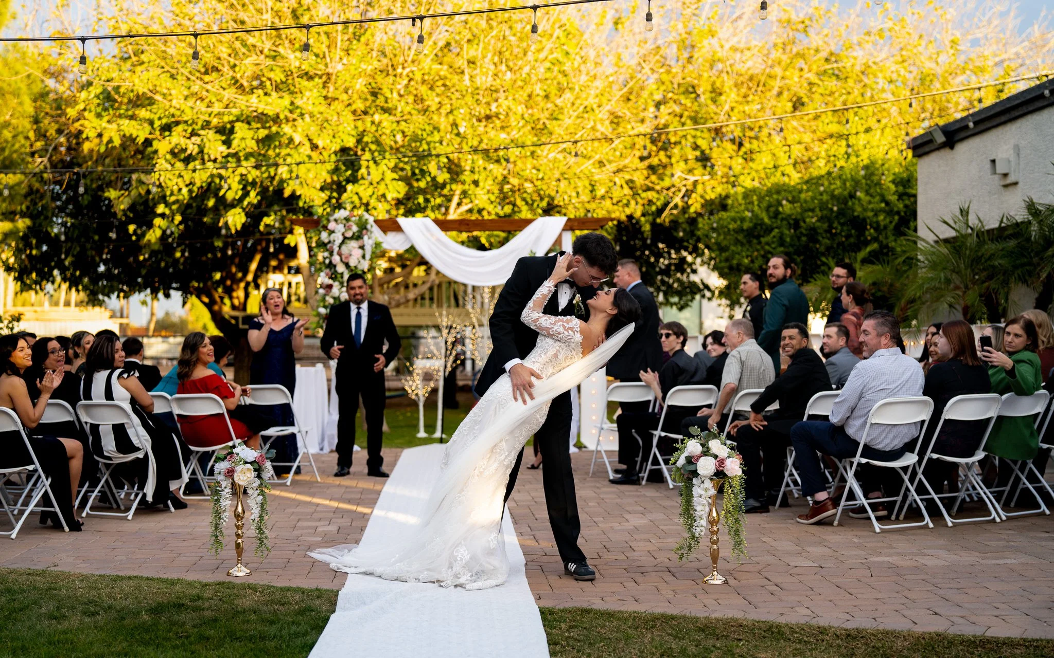 A bride and groom share a kiss during their wedding ceremony outdoors, with guests clapping in the background and floral decorations on the ground.