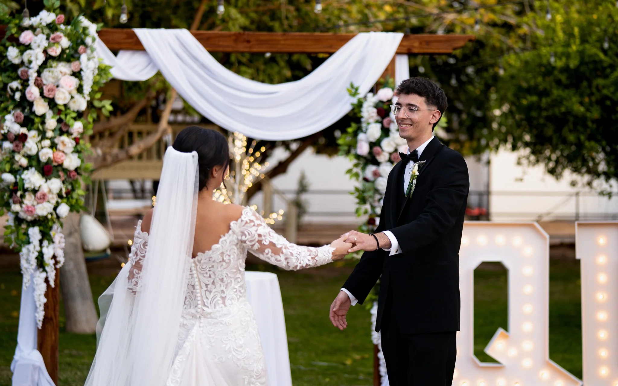 Bride and groom holding hands during outdoor wedding ceremony with floral arch and illuminated decorations.