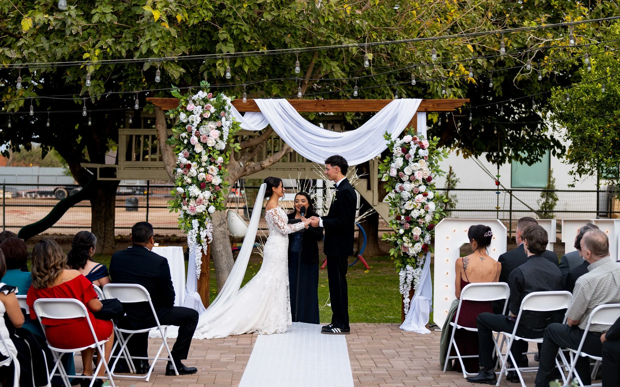 Outdoor wedding ceremony with a bride and groom holding hands under a floral arch, surrounded by guests seated on white chairs, in a garden setting with trees and string lights.
