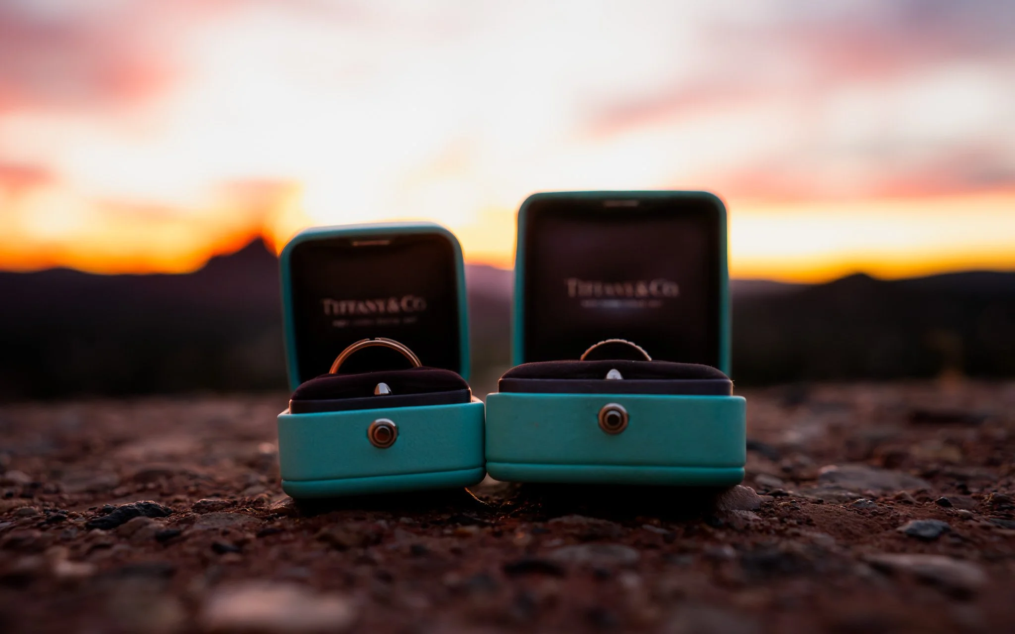 Two blue jewelry boxes with earrings inside, placed on rocky ground at sunset, with blurred mountains and colorful sky in the background.