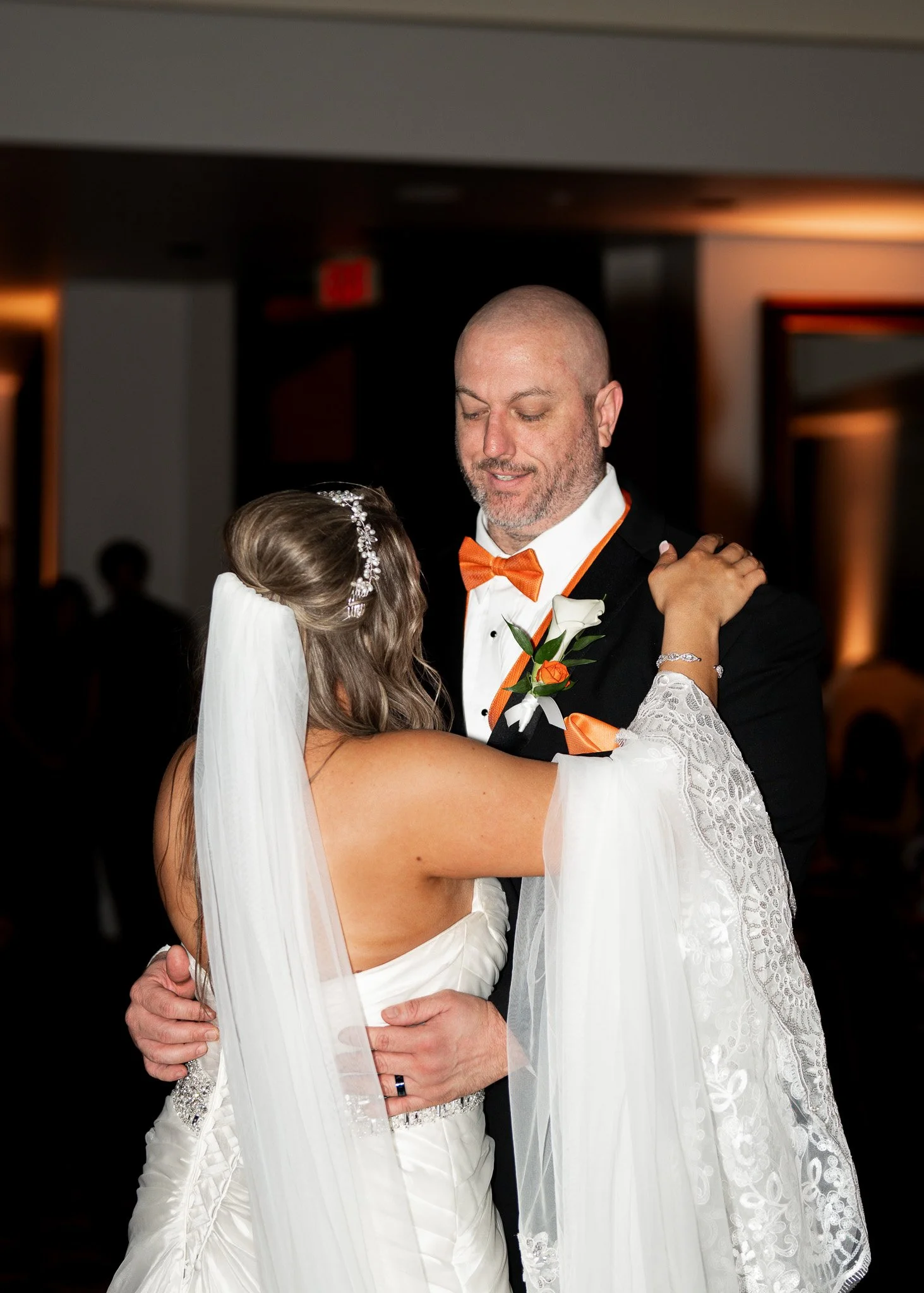 A bride and groom dancing at their wedding in formal attire, with the bride in a wedding gown and the groom in a tuxedo with orange accents. They are smiling and looking at each other, sharing a dance.