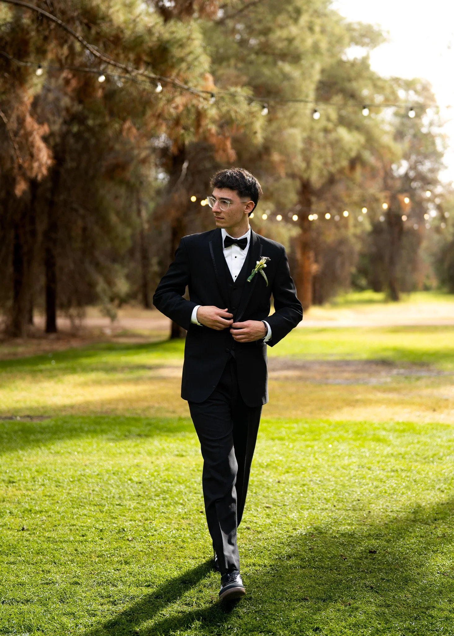 A man in a tuxedo with a boutonniere walking outdoors on a grassy area, with string lights and trees in the background, during what appears to be a wedding or formal outdoor event.