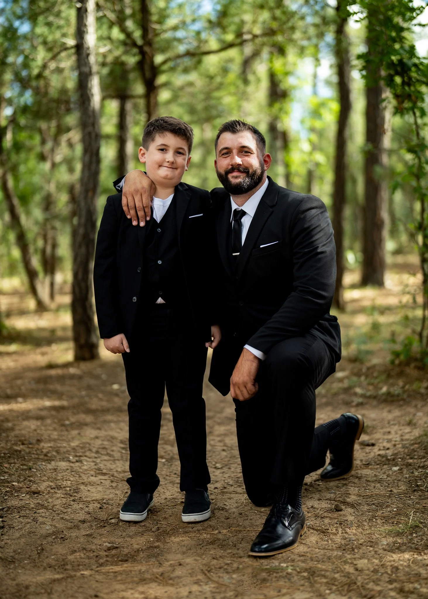 An adult man and a young boy in formal suits posing together in a forest.