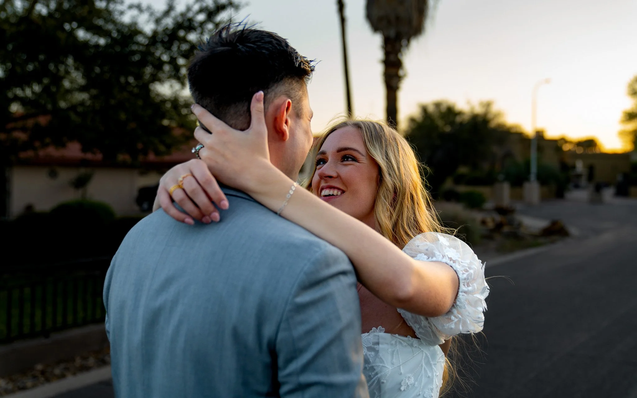 A woman and man embrace outdoors at sunset, looking at each other affectionately, with palm trees and a neighborhood in the background.