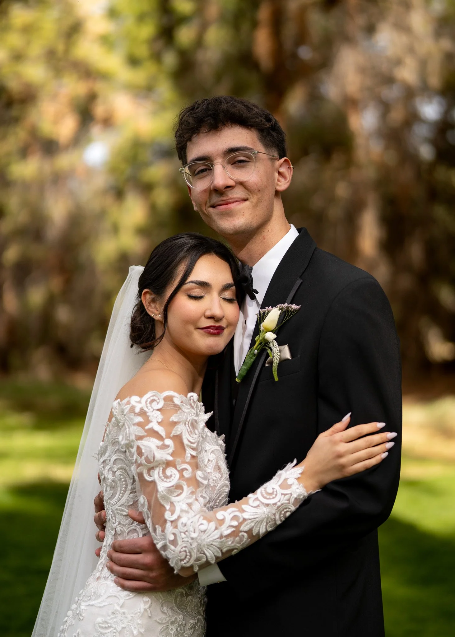A bride and groom embrace outdoors on their wedding day, surrounded by trees and greenery.
