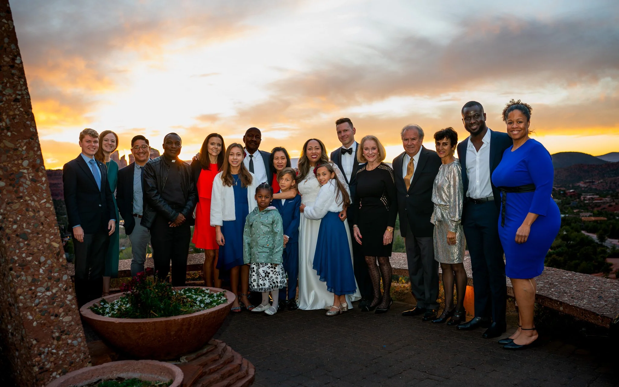 A group of diverse people dressed formally, standing together outdoors at sunset, celebrating a special occasion.