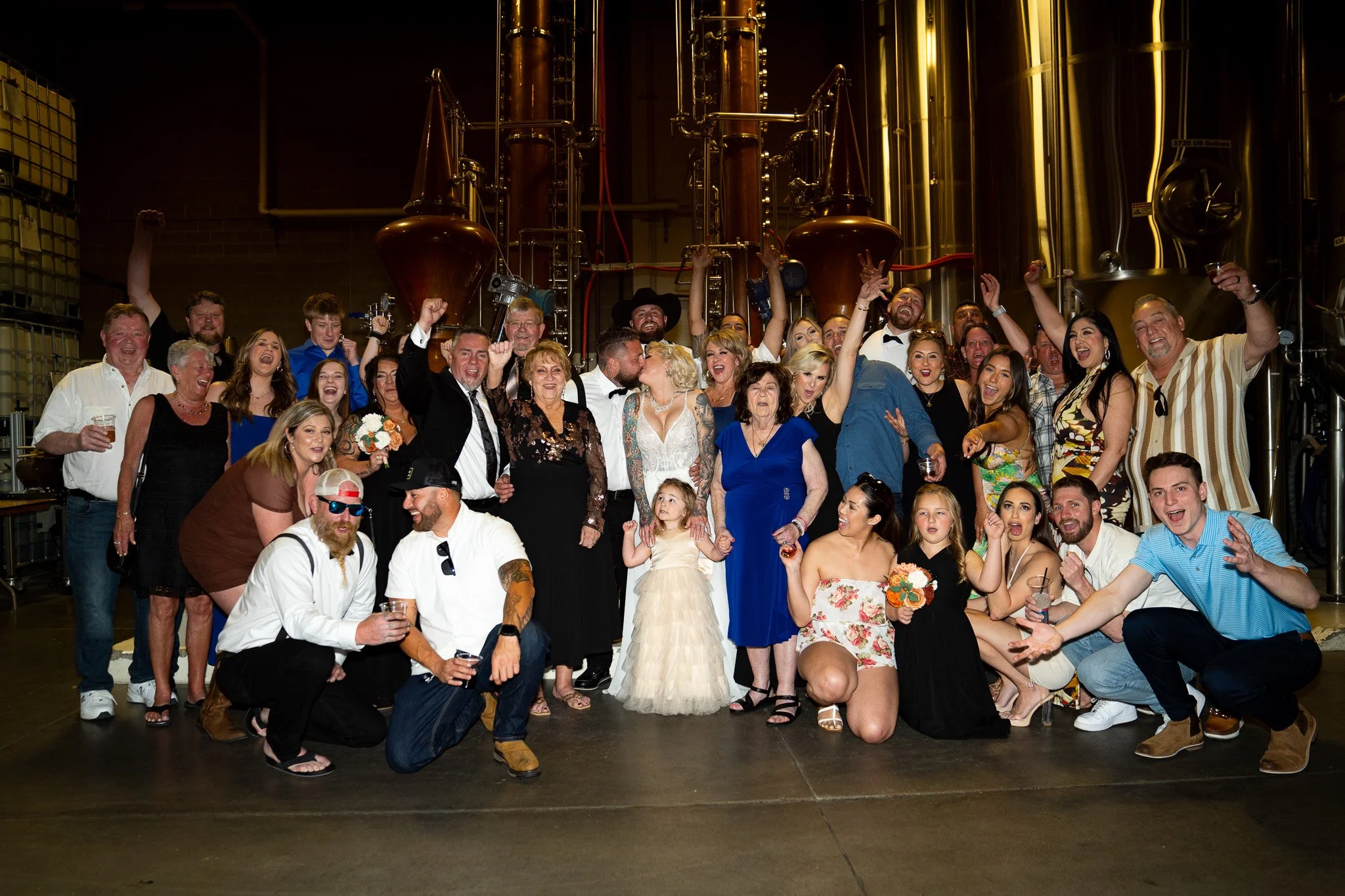Group of people celebrating at a wedding reception, posing in front of large industrial brewing tanks, some holding drinks, laughing, and engaging in a lively party.