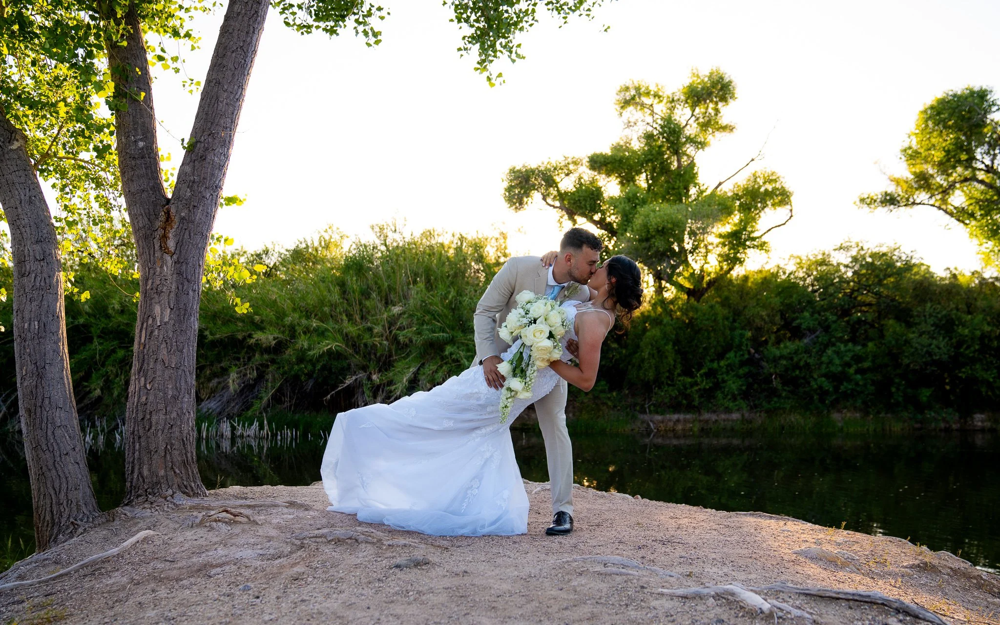 A newlywed couple sharing a kiss on a riverbank at sunset, with trees in the background and the bride holding a bouquet of white roses.