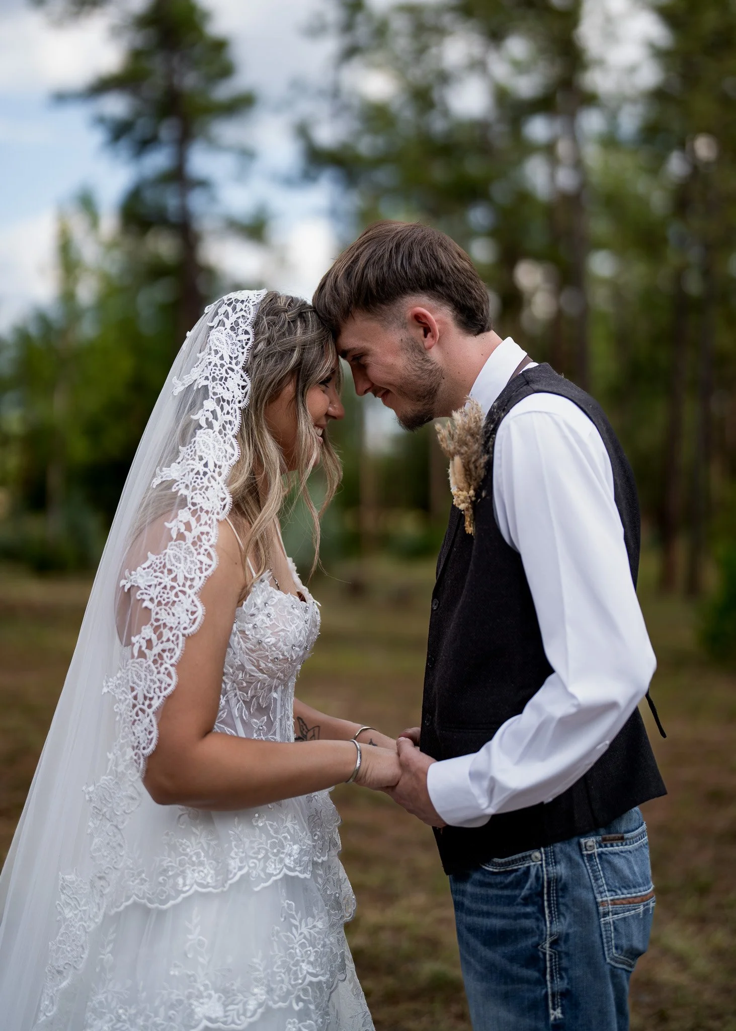 A bride and groom on their wedding day, standing close with foreheads touching outdoors, blurred trees in the background.