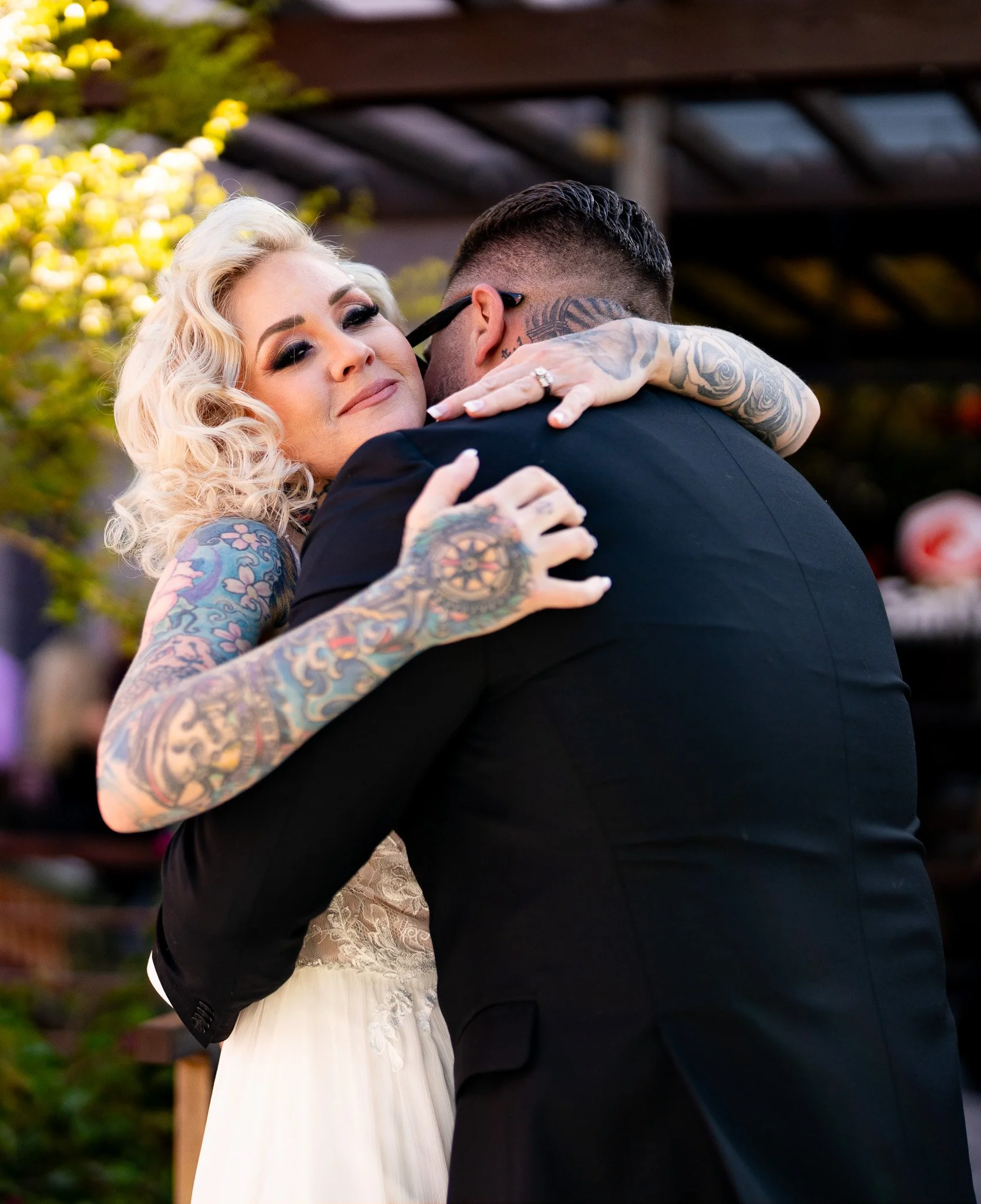 A woman with blonde hair and tattoos on her arms is hugging a man dressed in black, in an outdoor setting during daytime.