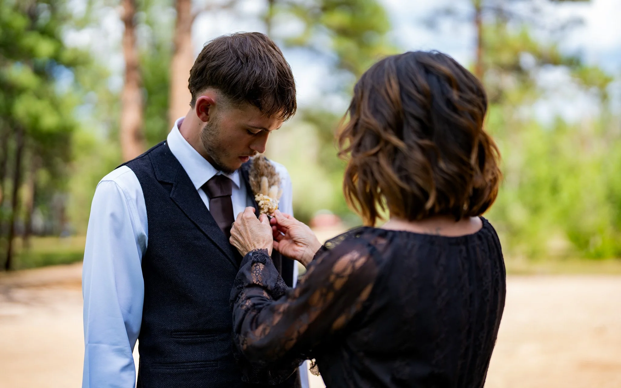 A woman pins a boutonniere onto a young man's suit jacket outdoors.