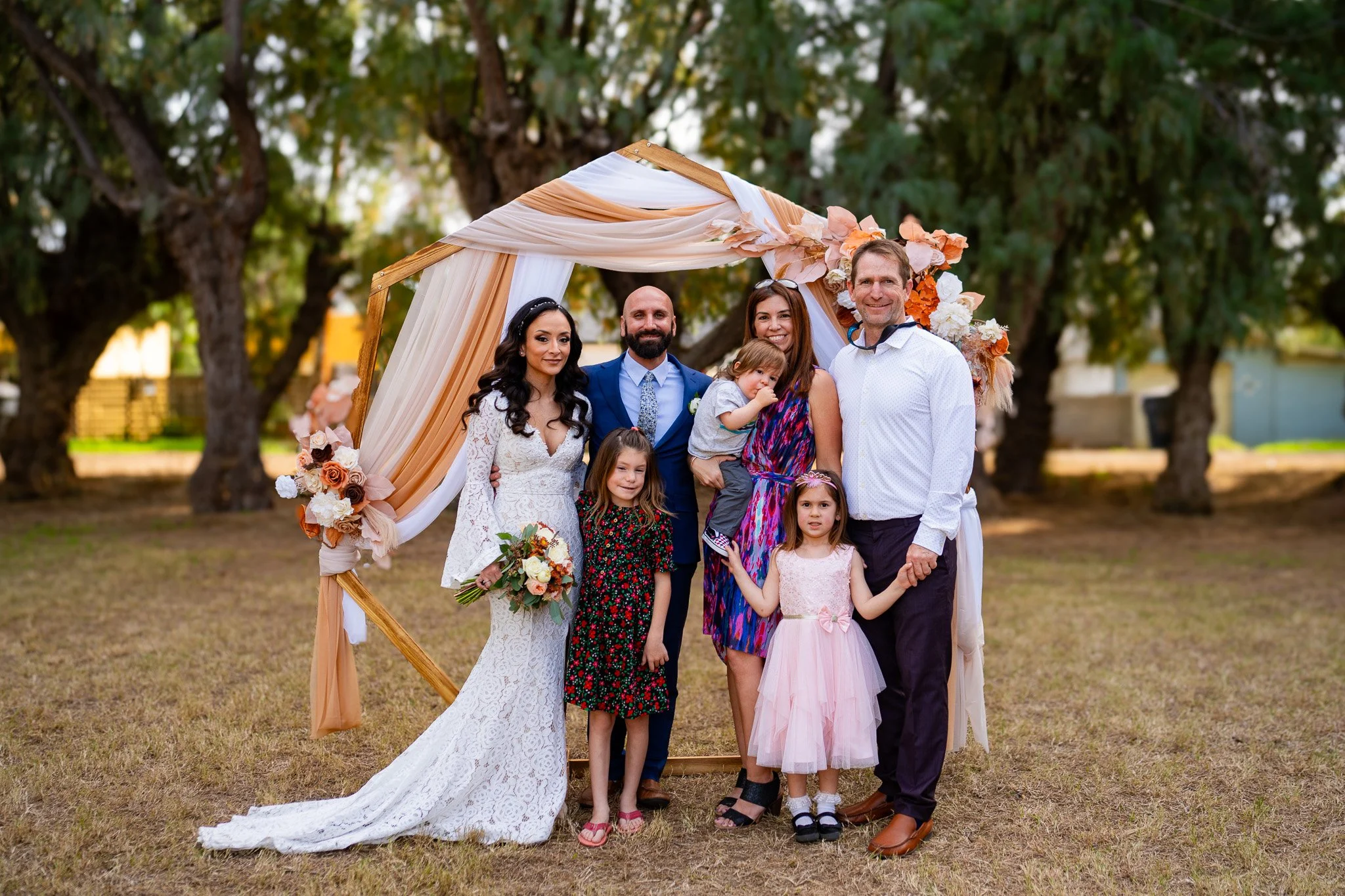 Group of people at a wedding, standing in front of a decorated wooden arch with draped fabric and flowers, outdoors with trees in the background