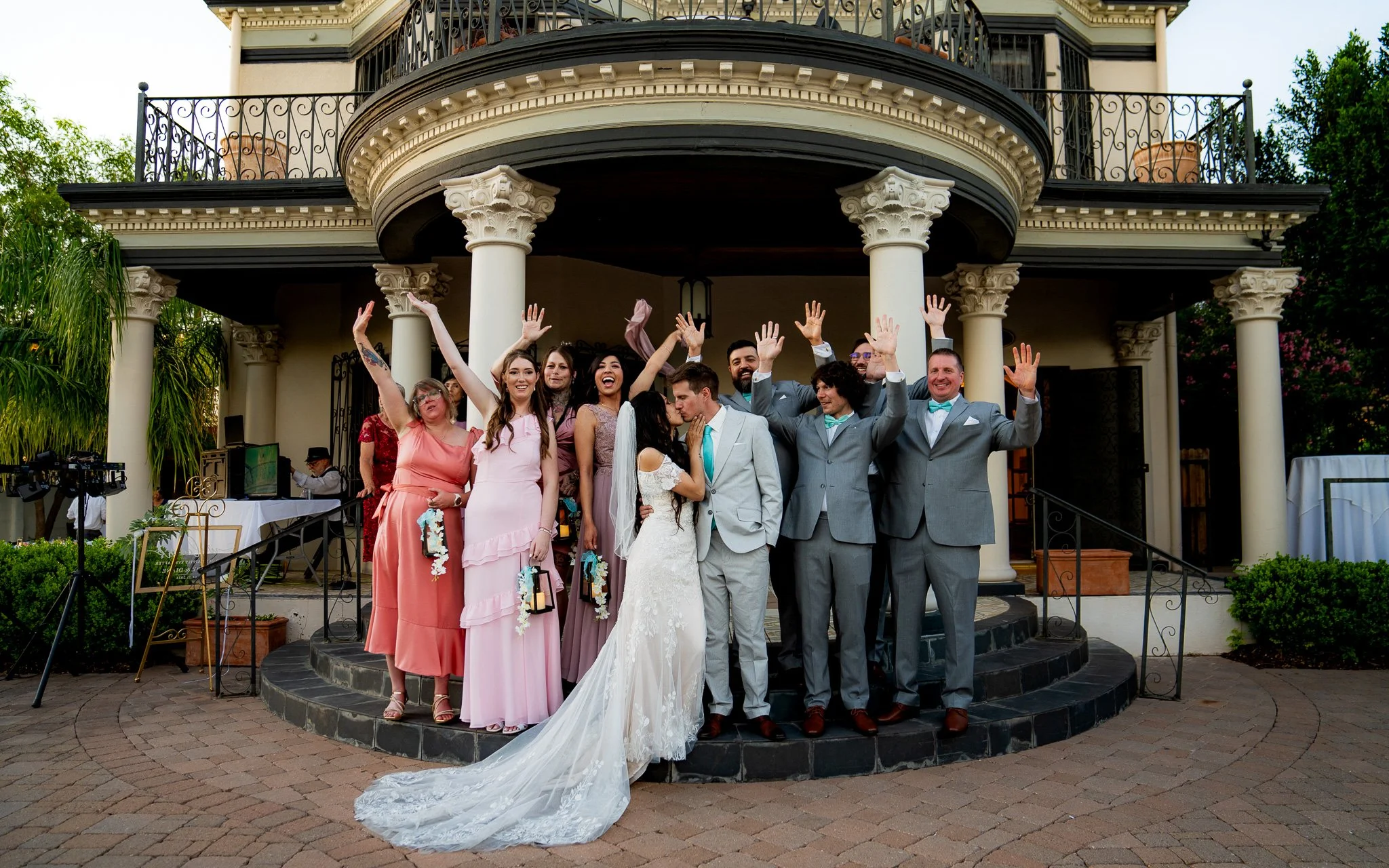 A group of people at a wedding celebration in front of a large historic house, with a bride and groom kissing in the center, surrounded by friends and family smiling and raising their hands in celebration.