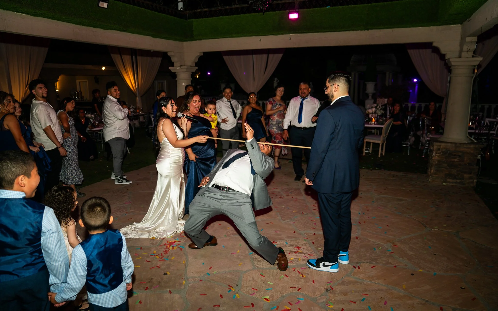 A lively wedding reception with guests dancing and celebrating, including a man in a gray suit dancing with enthusiasm, a woman in a white dress holding a microphone, and others watching and enjoying the party.