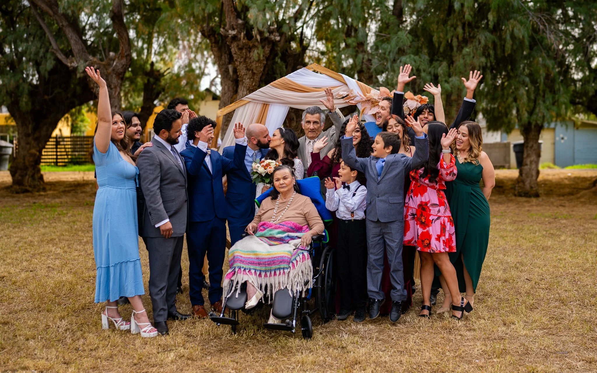 Family and friends celebrating a wedding outdoors, standing under a decorated canopy, with some raising their hands and others holding a bouquet of flowers.