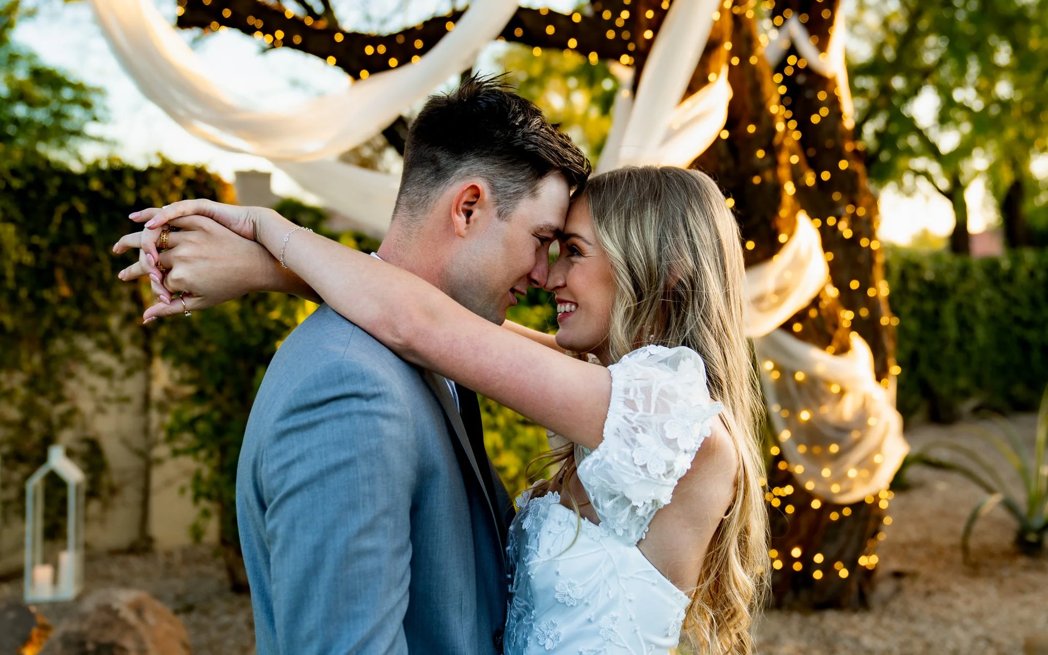 A newlywed couple is embracing outdoors at sunset, with their foreheads touching, smiling, and looking into each other's eyes. The background features a decorated arch with string lights and flowing fabric.