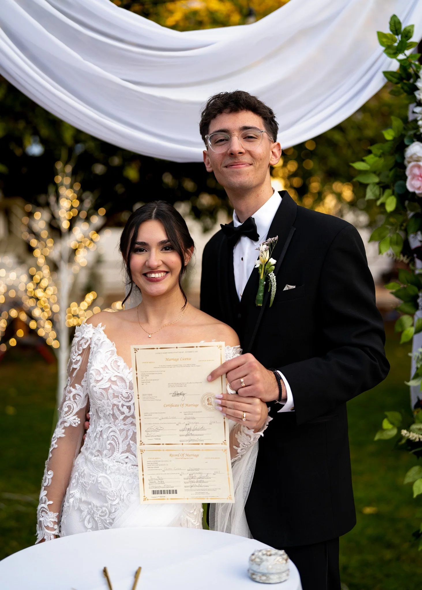 A newlywed couple standing outdoors, holding a marriage license and smiling. The bride is in a lace wedding dress, and the groom is in a black tuxedo with a bow tie. The background has trees decorated with string lights and white drapery.