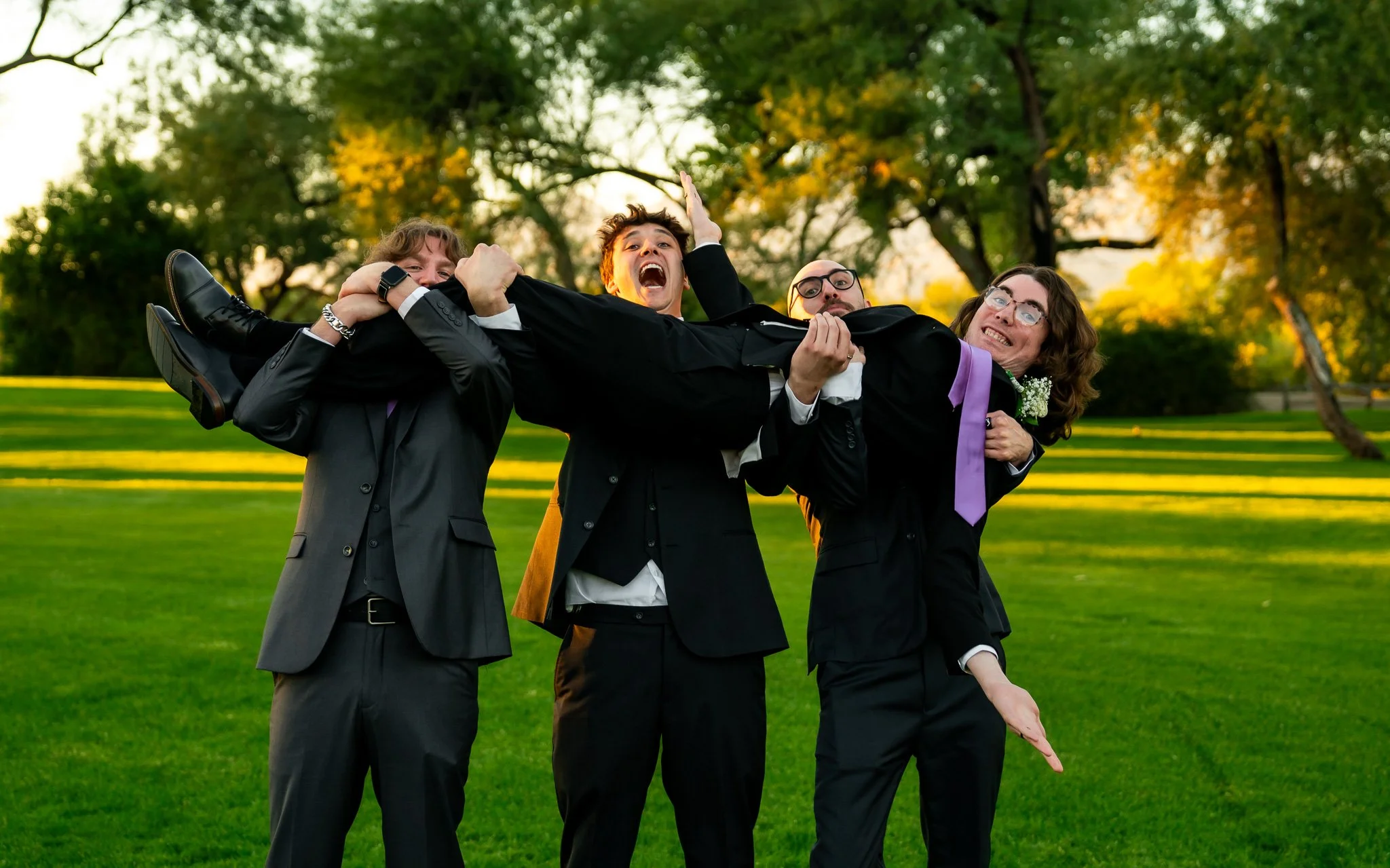 Four young men in suits, three holding up the fourth in a playful pose on a grassy field with trees in the background during sunset.