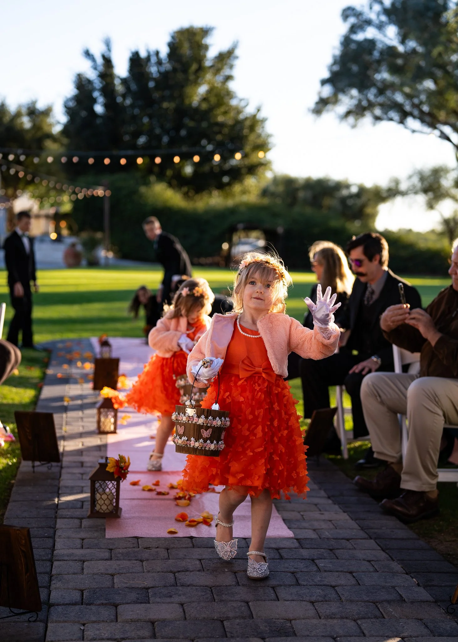 Young girls dressed in orange dresses participating in a flower girl procession at an outdoor wedding ceremony during sunset, with guests seated on either side and trees in the background.