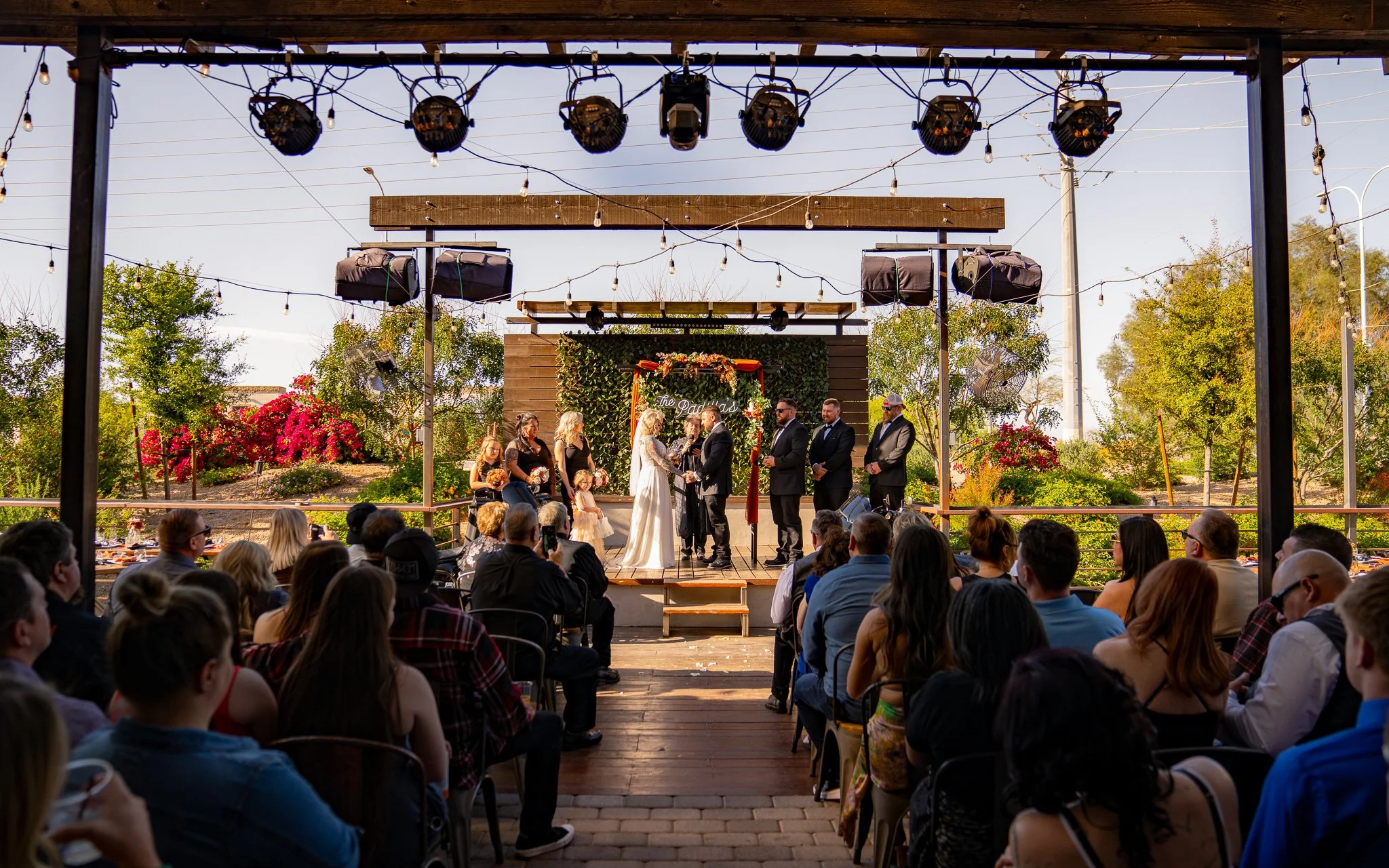 Outdoor wedding ceremony on a wooden stage with a floral backdrop, officiant, bride and groom, and guests seated watching.