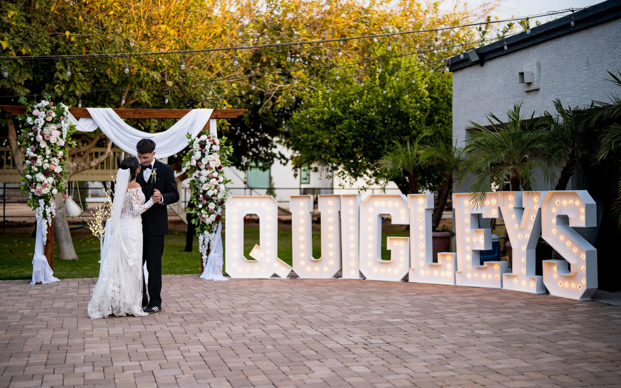 A bride and groom dancing at a wedding reception outdoors, with large illuminated letters spelling 'QUIGLEY' in the background.