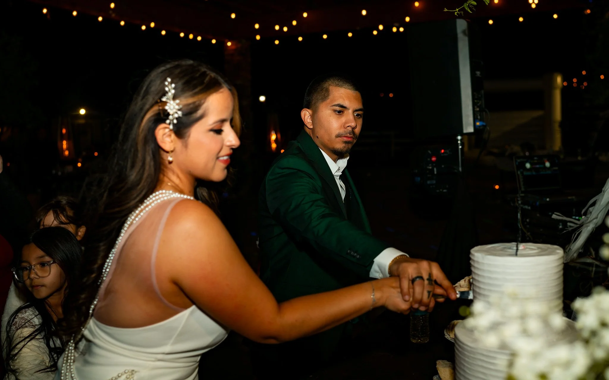 A bride and groom cutting a wedding cake at their reception, with string lights hanging overhead.