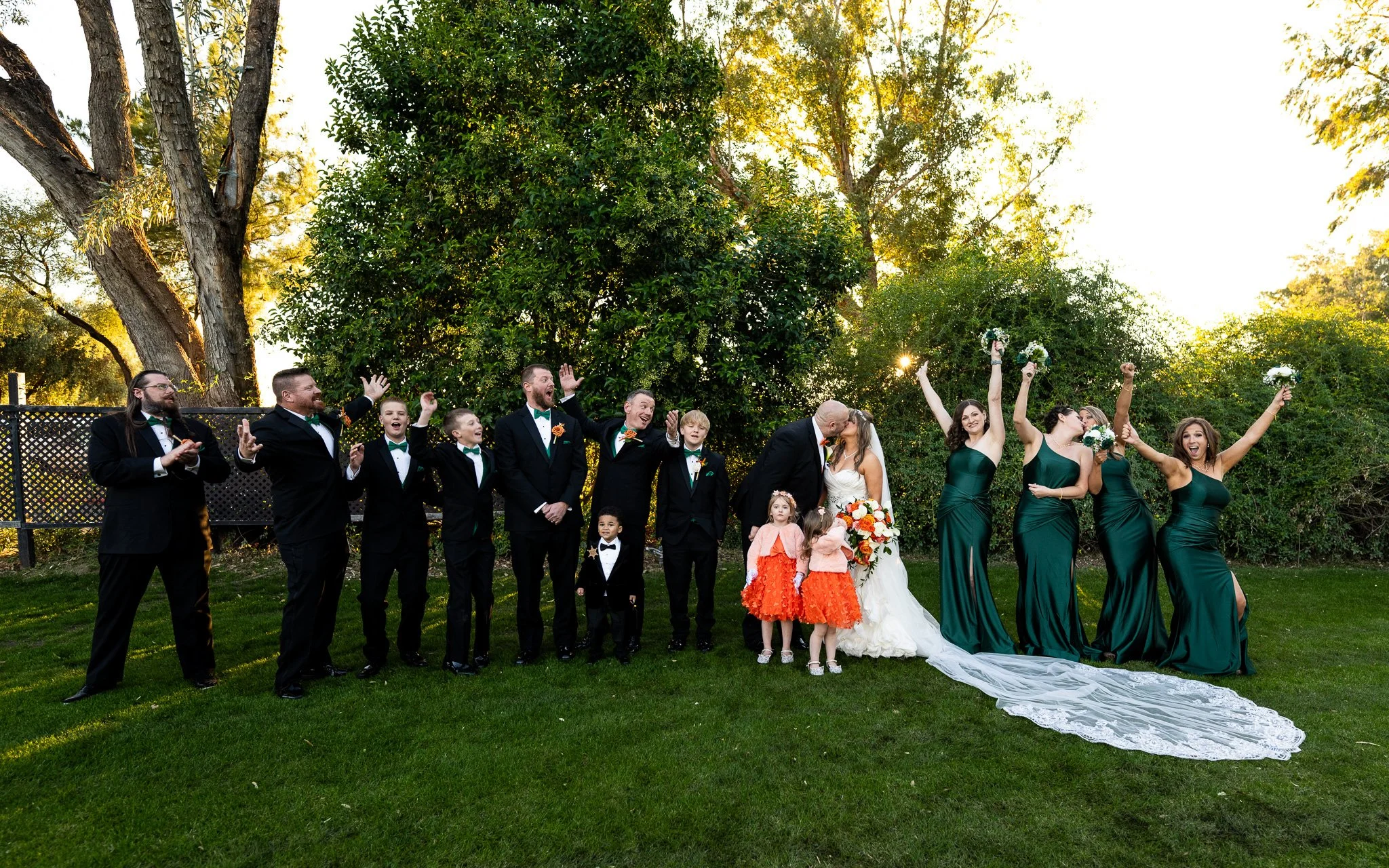 A wedding party of eleven people standing outdoors on grass at sunset, including the bride in a white wedding gown holding a colorful bouquet, the groom in a black tuxedo with an orange bow tie, six bridesmaids in green dresses holding bouquets, four