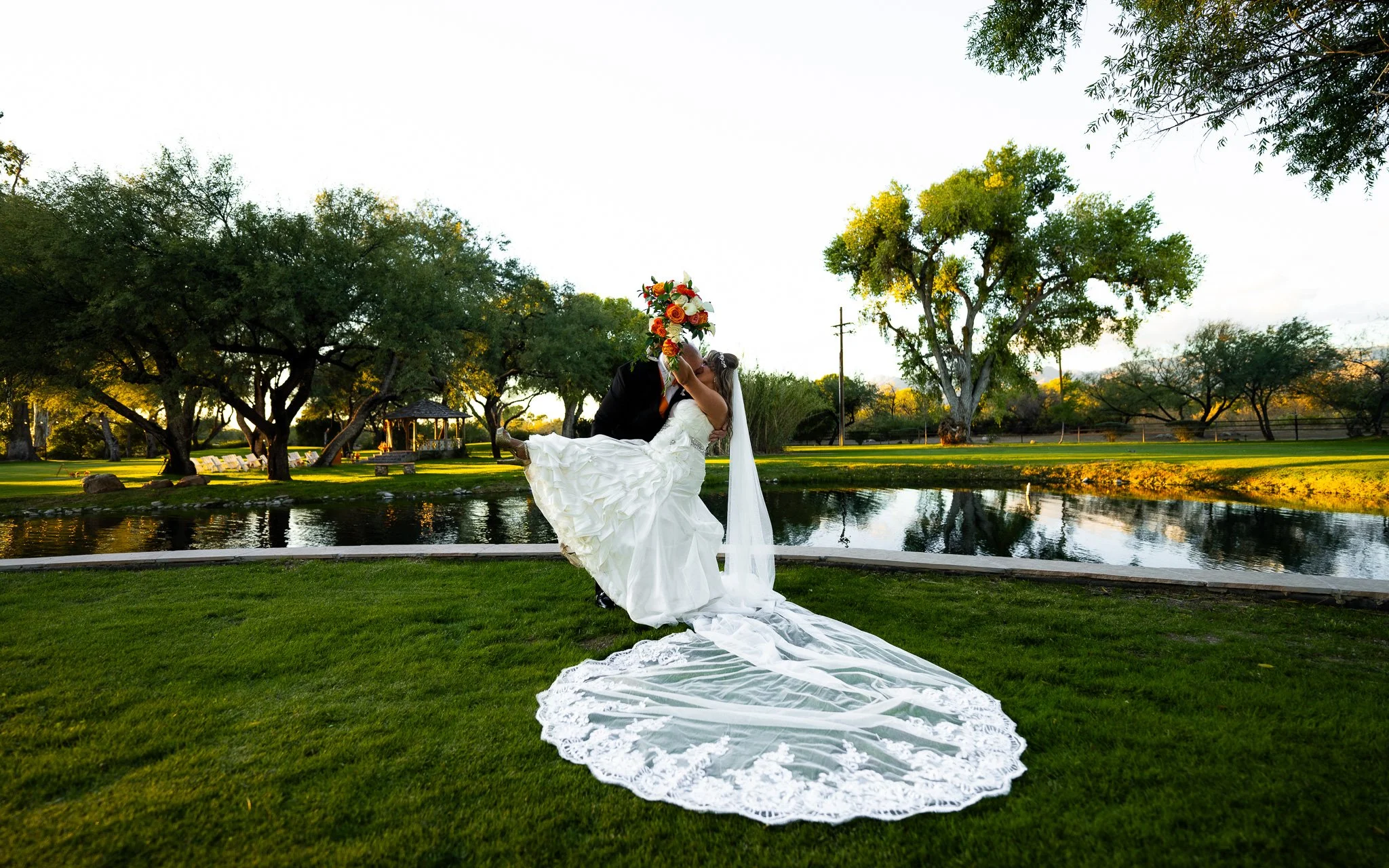 A bride and groom share a kiss outdoors by a pond with trees in the background, the groom lifting the bride in a white wedding dress with a long lace train, during sunset.