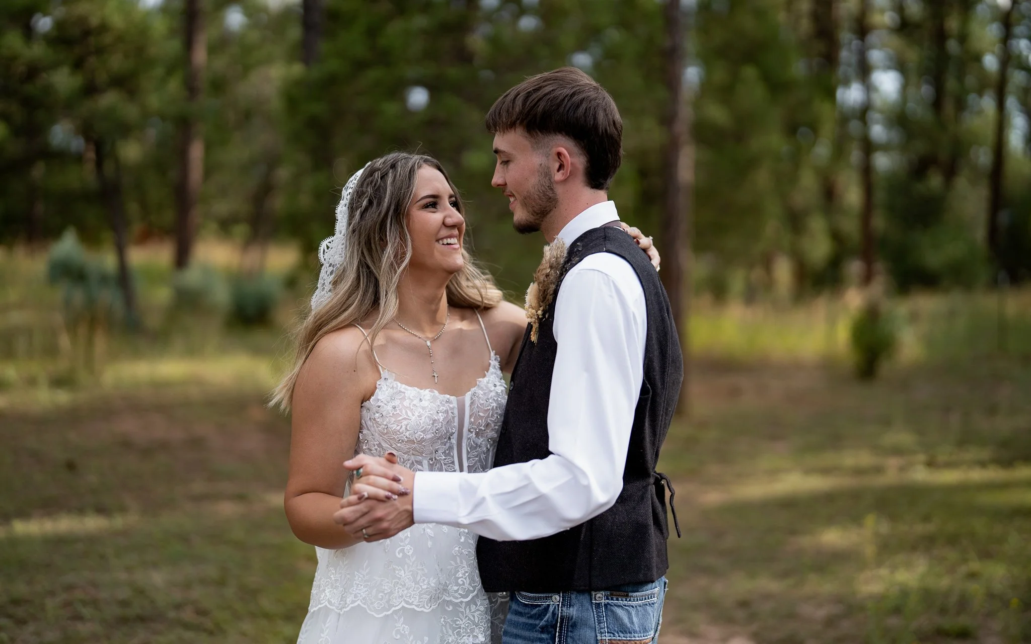 A bride and groom holding hands and smiling at each other outdoors in a wooded area during their wedding.